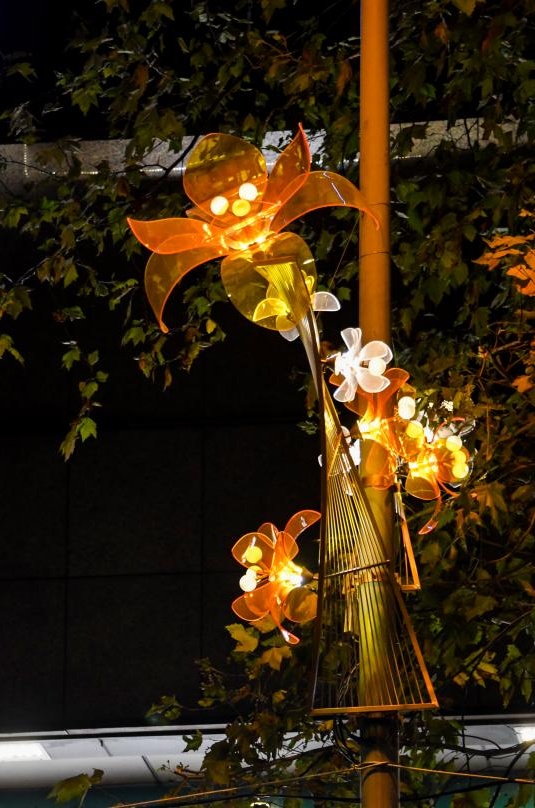以上海市市花白玉兰为主要设计形态,融合了“金丝银线”的理念和布局,契合了淮海路最美丽、最摩登、最有“腔调”和情调的购物街区时尚定位。