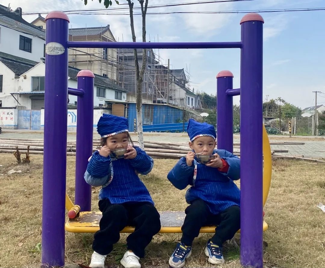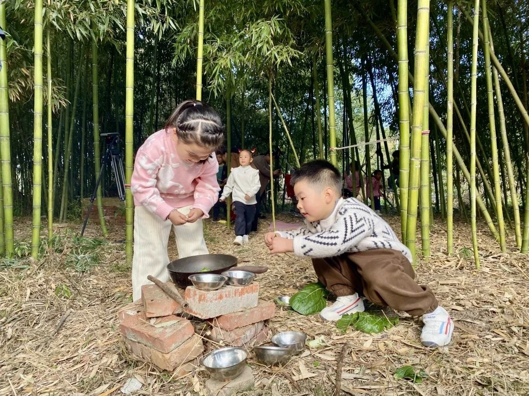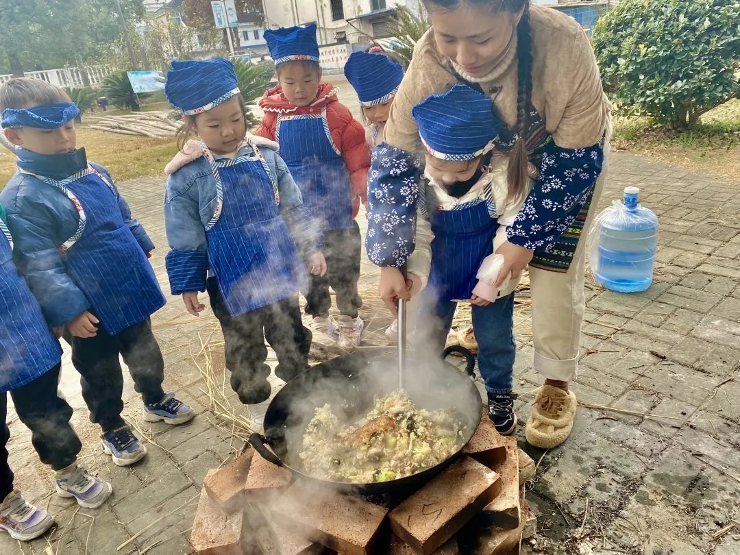 一大早,老师在宅基头上带领小朋友们摘菜洗菜、打水淘米,小小“厨师”们一起自制土灶饭。经过一番等待,小朋友们品尝到了自己亲手烧制的佳肴。