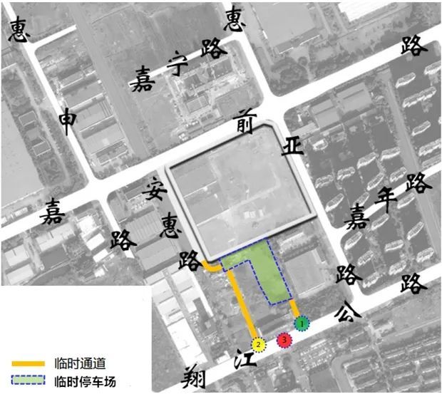 计划启用项目南侧空地设置临时停车场。在临时停车场东南侧、西南侧,各设置一条临时通道连接翔江公路。在临时停车场西北侧,设置一条临时便道衔接安惠路和临时停车场。同时,在翔江公路增设了一组信号灯,并对翔江公路两个邻近信号灯的联机协调信控方案进行了优化。