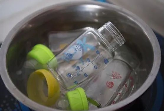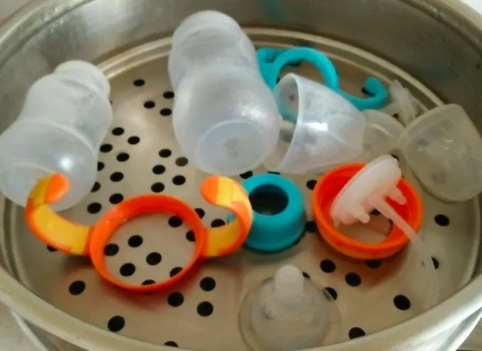 将奶瓶、奶嘴、盖子等打开,置于锅中,隔水蒸煮10分钟左右即可。