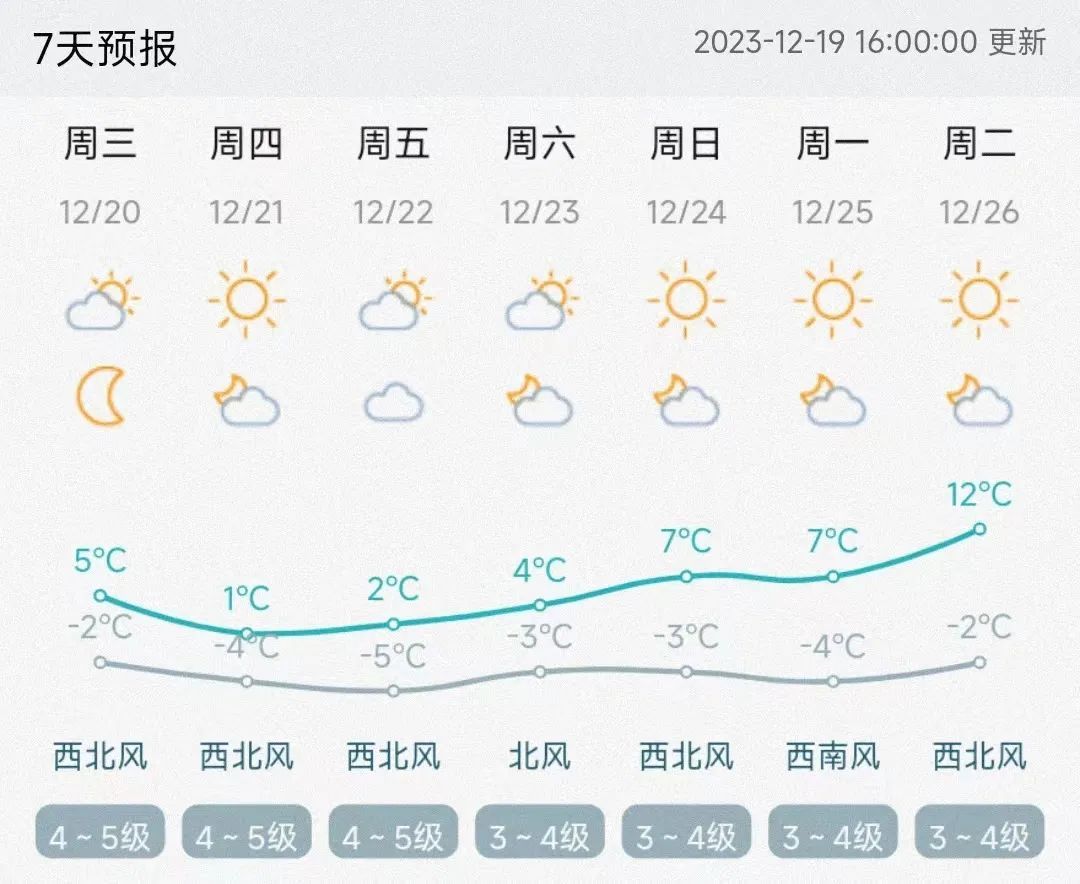 气象资料显示,受冷空气影响,今日白天风力变大最高温度3.6°C,最低温度0.2°C,西北风4-5级阵风6级,越到晚上体感越冷。未来一周主打晴冷天气,预计此次冷空气过程最低出现在22日早晨,最低温度-5°C,有冰冻或严重冰冻。请市民做好防寒保暖措施。