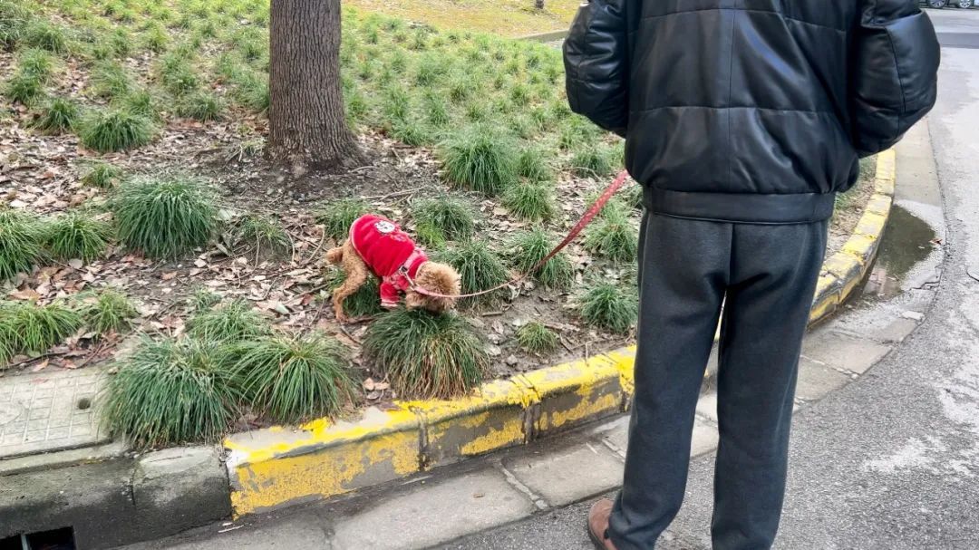 今晨,嘉定室外最高温度只有2°C,市民们都换上了厚厚的羽绒服,围巾、手套、口罩、帽子等保暖装备齐上阵,全身上下裹得严严实实,就连小狗出门都穿上了防寒服装。