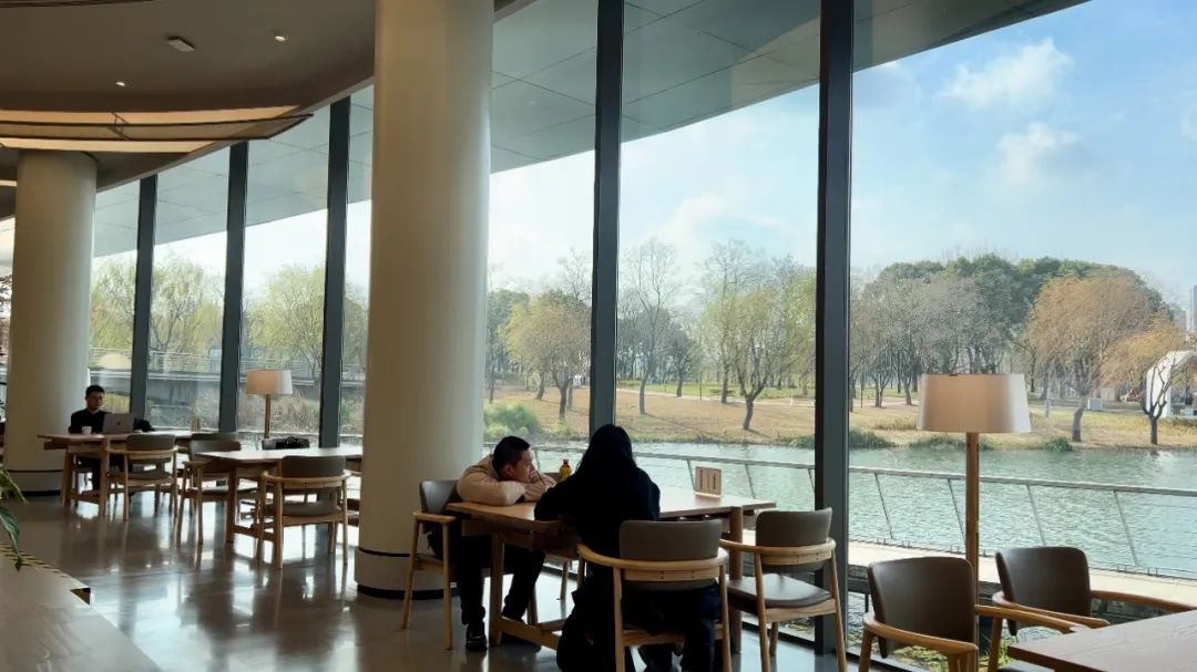 在嘉定远香湖边,微风吹过带来阵阵寒意。湖畔的“江南书局•疁城之瞳”里,市民在温暖的环形阅读区或办公或休息,或带着孩子读书玩耍。坐在超大落地窗边,室外是萧瑟的寒风和“冻人”的远香湖美景,室内温暖如春,书香、茶香、咖啡香,沁人心脾。