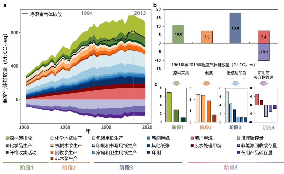 针对以上问题,该论文建立了首个涵盖全球30个主要造纸生产与消费国家长时序(1961—2019)、多阶段、多过程、高解析度的造纸行业温室气体排放数据集,揭示了该行业温室气体排放特征,从时间、阶段、过程、空间等多个维度识别了排放热点,并通过情景分析研究提出了考虑各国本地化特征的2050年净零排放策略。研究结果表明,1961—2019年,全球造纸行业温室气体累积排放435亿吨CO2-eq,其中,使用与废弃物管理阶段形成的碳存量抵消了超过100亿吨CO2-eq(图1)。原料采集阶段和使用及废弃物管理阶段的温室气体排放几乎占据了总排放的一半,凸显了生产阶段以外减排工作的重要性。其中,由不可持续浆木采伐带来的毁林和森林退化导致的温室气体排放(森林碳排放)占原料采集总排放的64%(即69亿吨CO2-eq)。近期COP28会议强调了保护森林和防止毁林的重要性,该研究结论表明实现森林的可持续管理对造纸行业实现净零排放目标尤为重要。