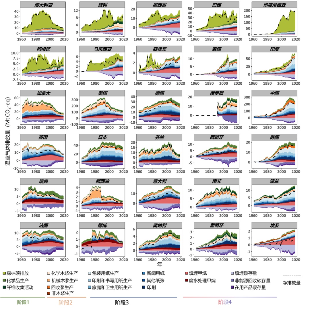 图2. 1961-2019年30个国家造纸相关部门的温室气体排放