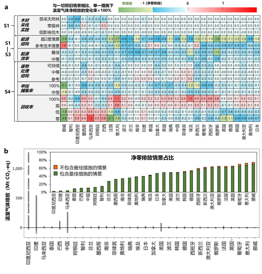 图3. 单一措施对30个国家2050年温室气体排放的影响和所有情景下温室气体排放量