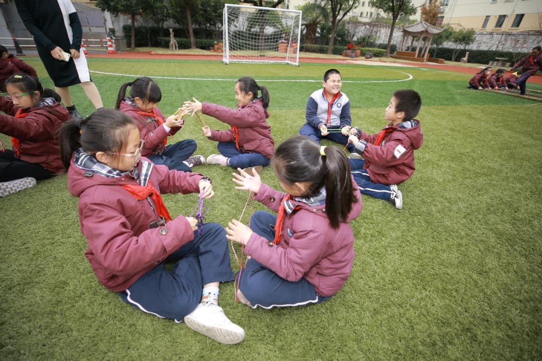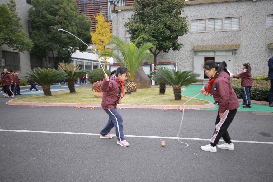 操场上,孩子们正在开心地玩着各种中国传统游戏,学生们在学游戏、玩游戏的过程中得到身心的休息,“两枚橄榄核”“一纸同心圆”,简单的玩具却可以让他们围在一起玩很久,积极地思考与讨论,不断挑战努力赢得胜利的他们学会了合作,感受到了积极进取的快乐。