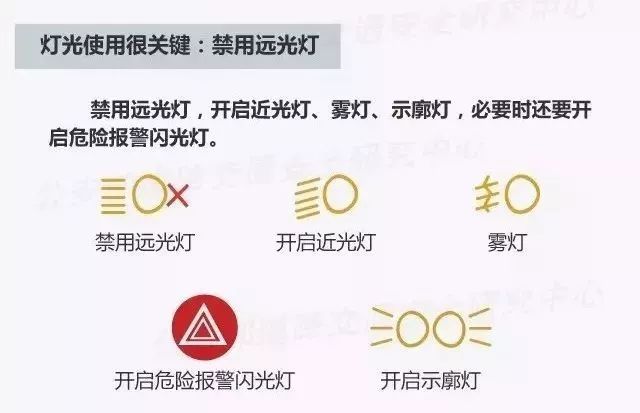 遇到雾天时应及时开启雾灯、近光灯、示廓灯、前后位灯和危险报警闪光灯,切记不要使用远光灯。因为远光灯是向上方照的,射出的光线被雾气漫反射后会在车前形成白茫茫一片,反而容易致使驾驶员视线不清。
