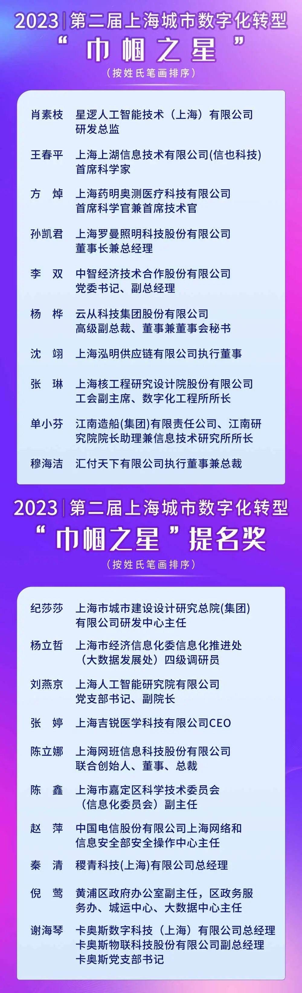 为进一步激发女性科技人才创新创造活力,充分展示优秀女性在上海城市数字化转型实践中的突出成果,激励广大女性科技人才把握建设制造强国、网络强国、数字中国的战略机遇,立足本职、锐意创新、追求卓越,在建设具有世界影响力的“国际数字之都”中贡献巾帼力量,市经济信息化工作党委、市经济信息化委、市妇联联合开展了第二届上海城市数字化转型“巾帼之星”选树活动,经资格审查、初审、终审、个人信用审核和公示等环节,现决定对2023第二届上海城市数字化转型“巾帼之星”及提名奖获得者予以表彰。