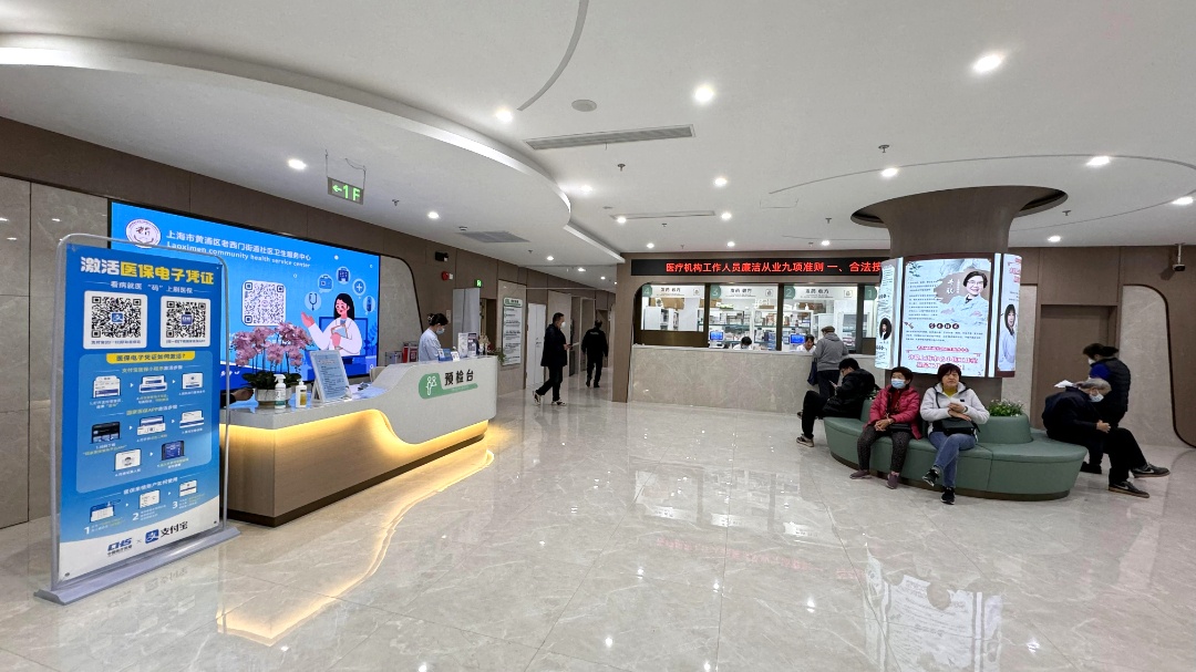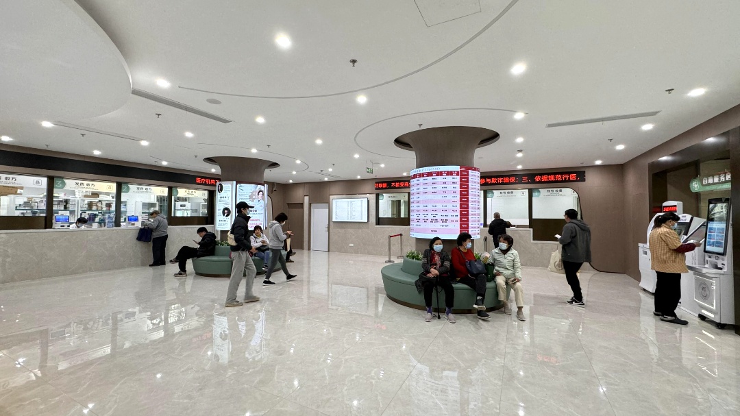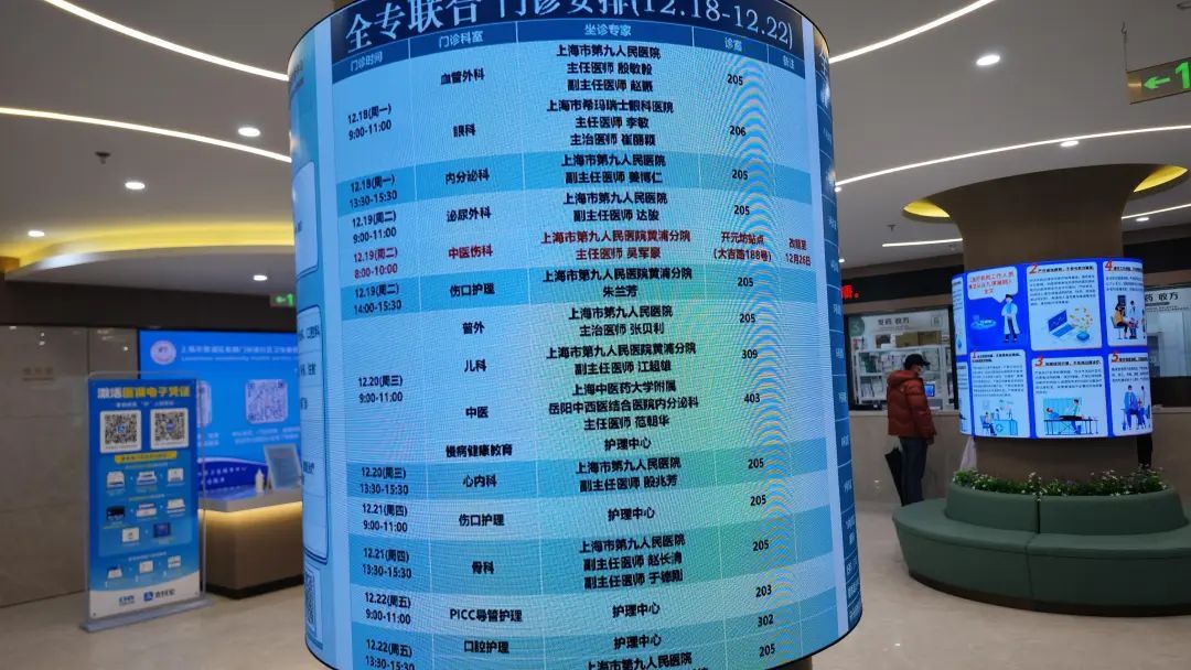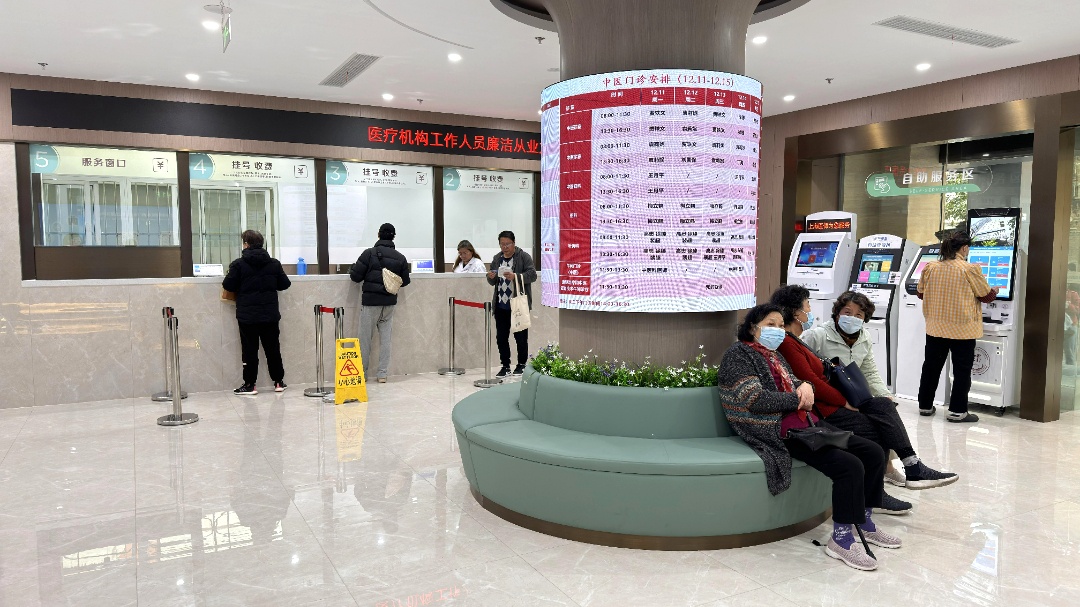 在全新打造的门诊大厅内,不少居民正坐在座位上小憩,不同于一般医院大厅冷冰冰的不锈钢座椅,这里的椅子是圆形设计,围绕立柱一圈,上面铺设软垫,就诊居民坐在上面,十分舒适,甚至会让人忘记自己是来医院看病的。不光如此,两根大立柱上设计了360°的环形电子大屏幕,将中心许多特色服务内容显示在上面。此外,还有每天的科室、医生排班表,细致到上午、下午每个时间段分别是哪个医生,一目了然。这也让一些操作手机不熟练的患者十分受用,选择自己想要的时间段和医生,到一旁的服务台就可以咨询或者预约,十分方便。而对于擅长使用手机的居民来说,也可以扫描大屏幕上的二维码,在手机上完成预约。进门处,还有一块自助挂号区域,可以使用机器进行现场预约,各种智慧化的服务,让居民的就医过程越来越便捷。