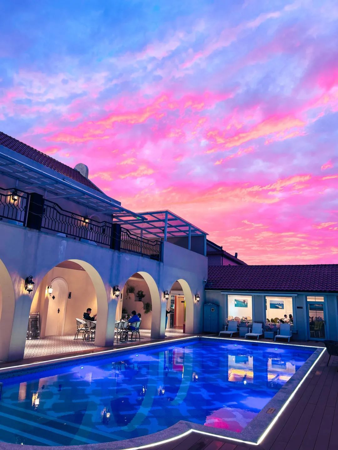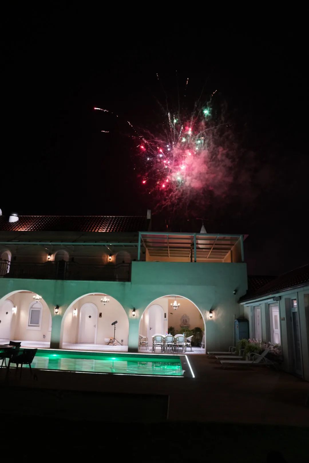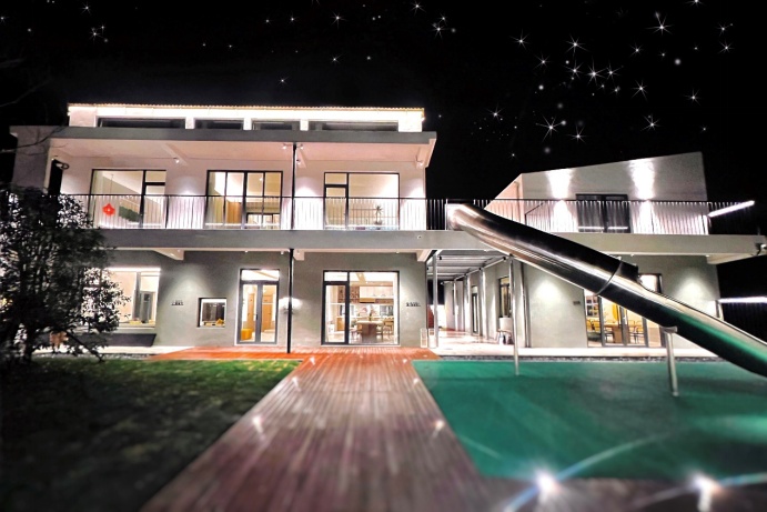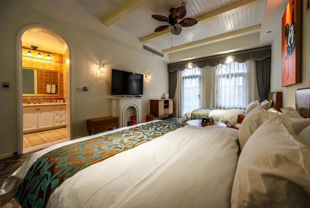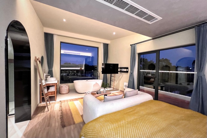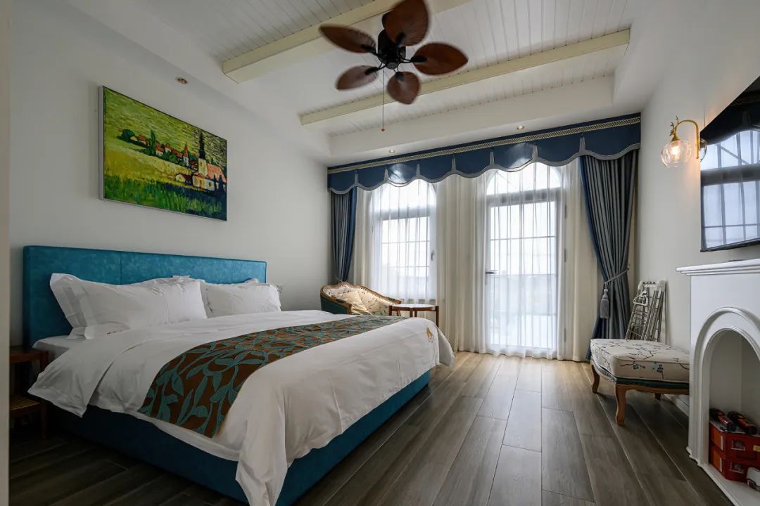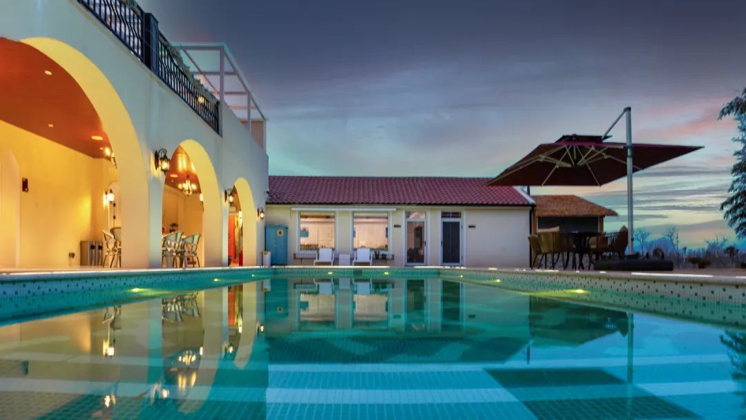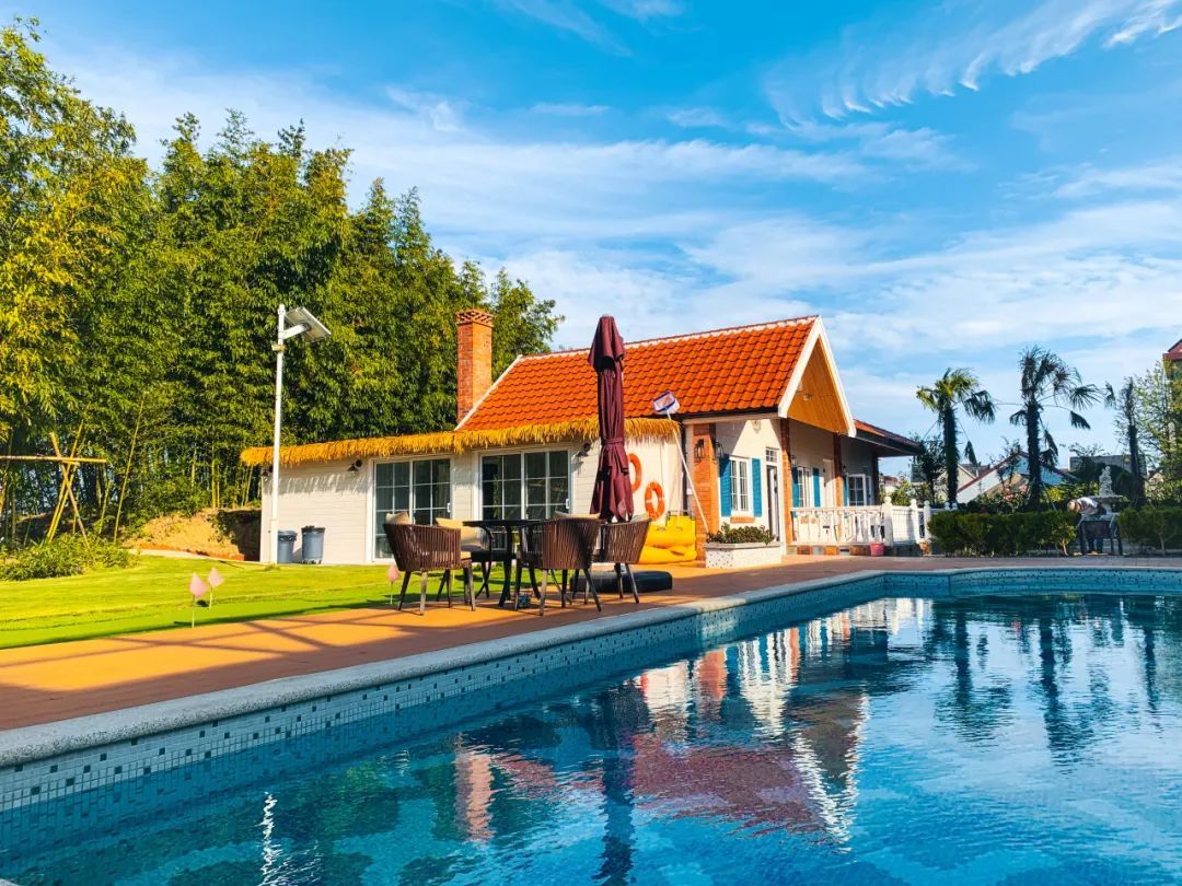 民宿内桌球、卡拉OK室、棋牌、烧烤等娱乐施设应有尽有,更有自带大草坪和小河码头,供露营垂钓和皮划艇,分布与主楼和东苑的9间客房,赏霞、赏竹、观云、观鹭、听雨等房如其名、由设计师主理人精心营造的设计风格更是恰到好处,宾至如归。加上独特的地中海拱廊和景观泳池,民宿在星级酒店的舒适度和民宿体验感的平衡上做到极致,每个房间打开门窗都会有不一样的风景,让客人足不出户就能拥有一个难忘轻松的美好假期。
