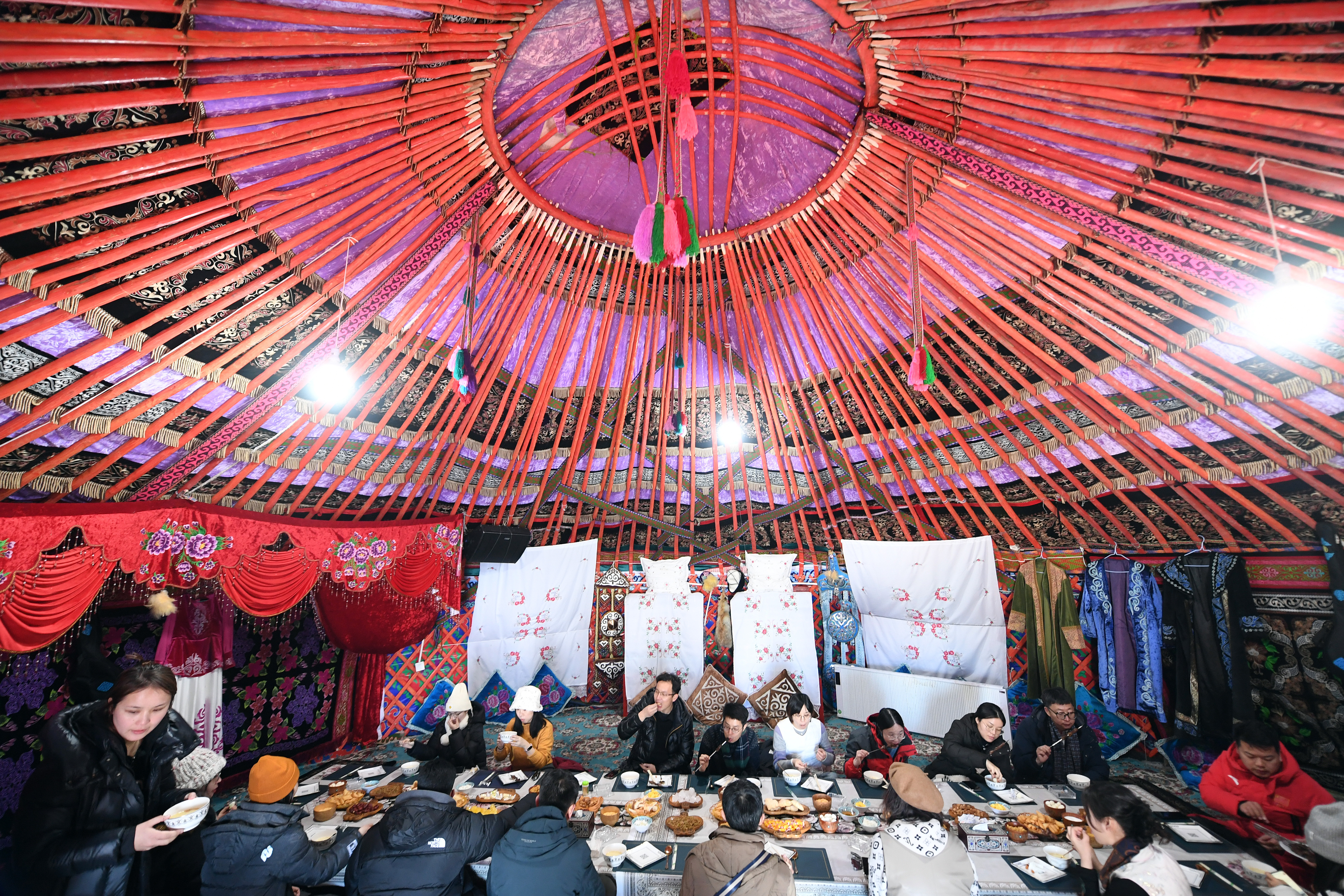 “那拉提在哈萨克语中是高大的骏马的意思,这里有梦幻般的冰雪雾凇、连绵宁静的山峦、奔腾于雪原的马儿,还有热情好客的牧民……“伴随着导游的讲解,“每个角落都是一幅绝美风景画”的冬季那拉提揭开了神秘的面纱:乘坐今年刚刚投入运营的那拉提索道直达天界台,银装素裹的空中草原辽阔壮美;观看赛马、叼羊表演,体验马拉爬犁、雪地摩托,感受当地特色活动的力与美;走进牧民居住的毡房,浓郁的哈萨克族民俗风情扑面而来……
