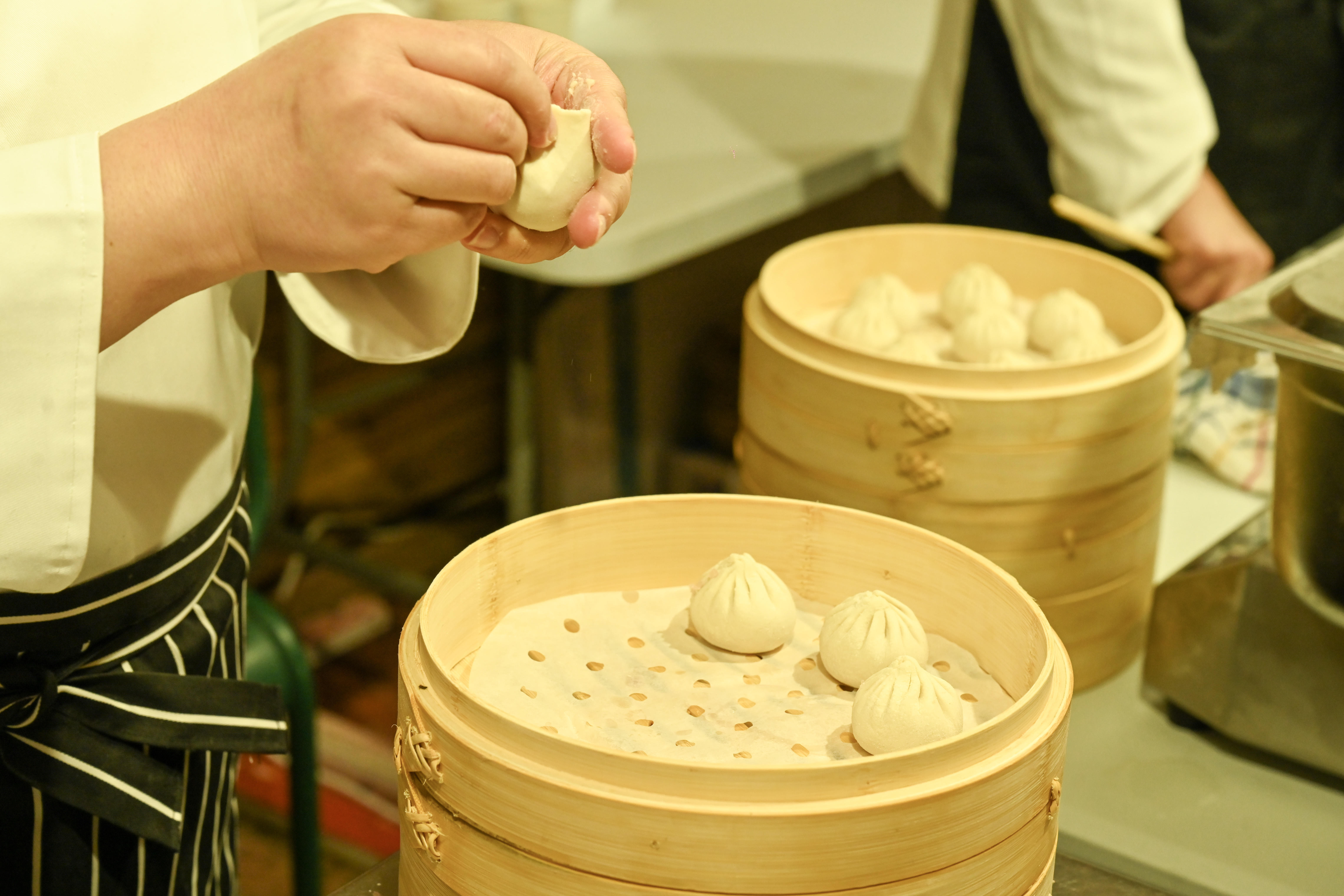 在众人的围观下,一块只有9克重的小小面剂子在两根擀面杖的默契配合中变成周围薄、中间厚的太阳形面皮,包裹住了21克的馅芯,每一道褶子都长短粗细均匀整齐……短短十几秒的工夫,一只形似宝塔的南翔小笼馒头就屹立在了游玉敏的掌心上,大家情不自禁地举起手机、相机记录这一时刻,同时也更加期待接下来的品尝环节。