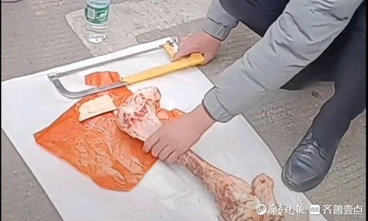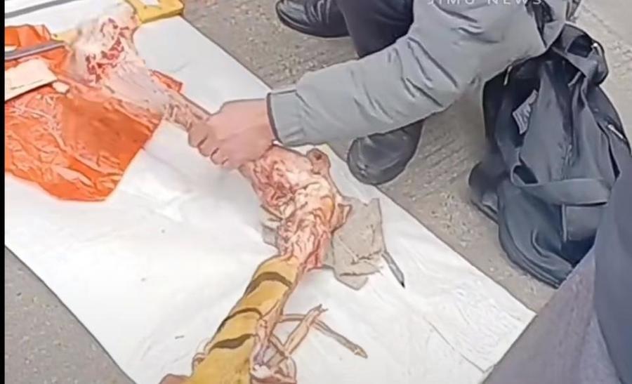 发布的视频显示,“虎骨”明目张胆地摆放在街面上,甚至骨头上还疑似附着“虎皮”,而商贩时不时地手握钢锯摆弄着“虎骨”。
