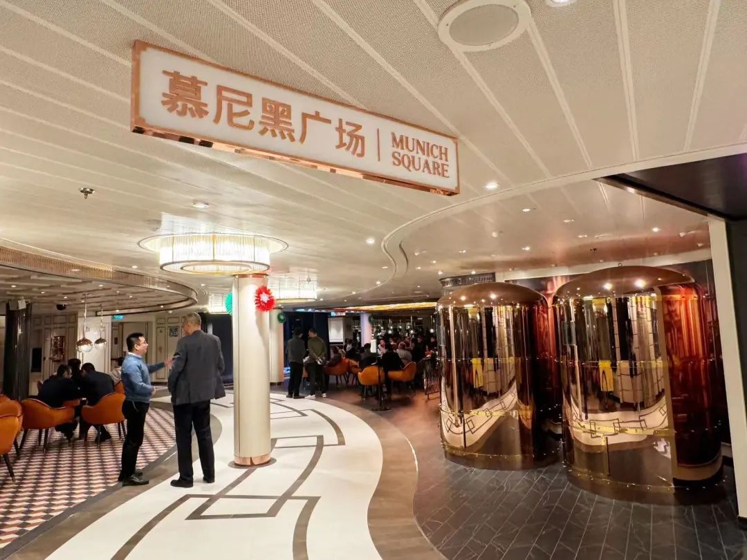 来到位于5层的慕尼黑广场,这里有酒吧、驻唱、美食,上演着邮轮夜生活