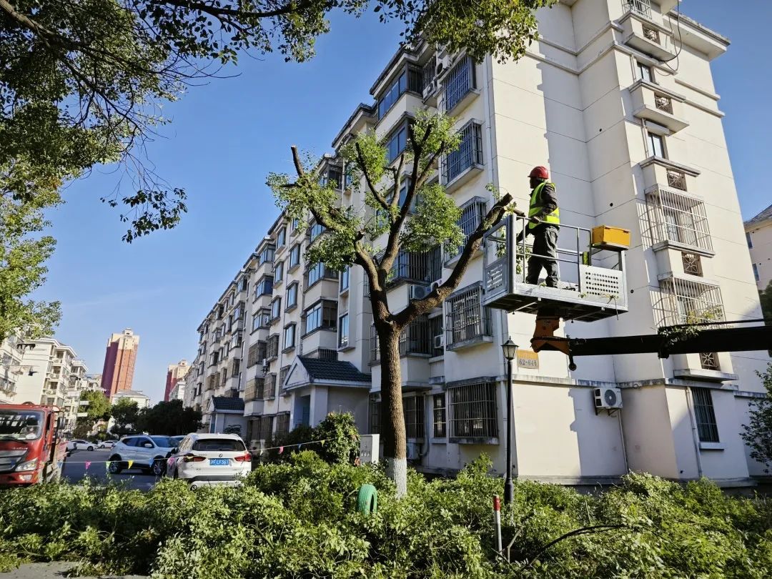冬季是树木修剪的最佳时期,居委会多次联系街道相关部门递交申请,只为早日把阳光送进居民家中。12月10日,上海二博绿化工程有限公司的升降车开进小区,物业工作人员提前通知居民将汽车驶离修剪现场、设定安全施工区域、维持现场秩序。施工过程中,绿化工人严格按照树木修剪标准规范操作。随着第一棵“样板树”修剪完毕,围观居民纷纷表示修剪后很清爽,希望尽快轮到自己所在楼幢。