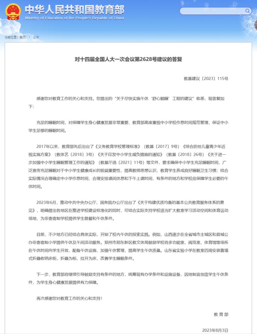 据新华社报道,日前,教育部对“关于尽快实施午休‘舒心躺睡’工程的建议”做出答复,表示高度重视中小学校作息时间规范管理,将继续引导鼓励支持有条件的地方,因地制宜创造学生午休条件。
