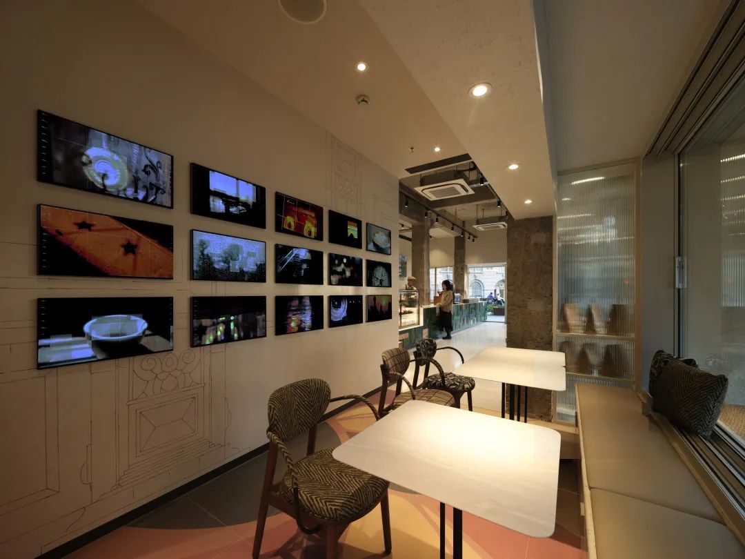 坐席区侧面墙上是15幅动静交错的数字屏组成的艺术墙,每块屏都呈现了武康街区在百年时光变迁中不同的生活场景,动态的时光影像和墙体上用线条勾勒出的武康大楼建筑特征遥相呼应,动静间叙述着武康大楼的故事。