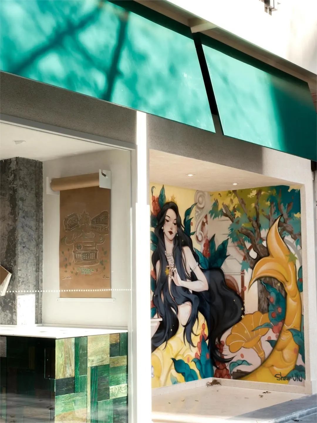 站在武康大楼的街角,通体白色的建筑上一抹绿色特别醒目,而一侧墙面上“东方风格”的塞壬更是格外吸引眼球。黑色的长发造型多了几分亲近感,美人鱼长长的明黄尾巴,在咖啡花、武康路秋日梧桐树、武康大楼剪影与上海市花——白玉兰的拥簇下,更是平添了优雅与精致。