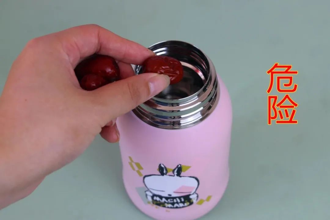 对于胖大海、红枣等易发酵的食材,如果长时间泡在保温杯中,易发酵产生气体,形成高压。突然拧开杯盖时,巨大的压力会冲顶杯盖,一旦弹出击中头面部,可能造成伤害。