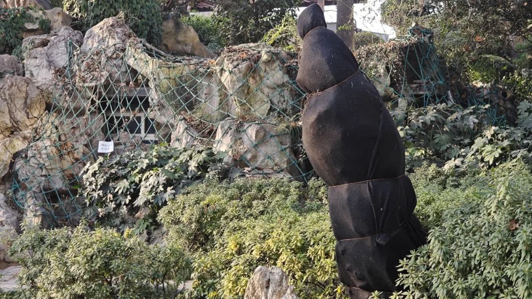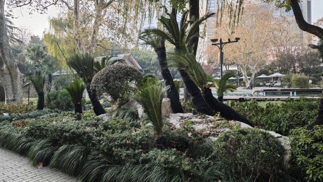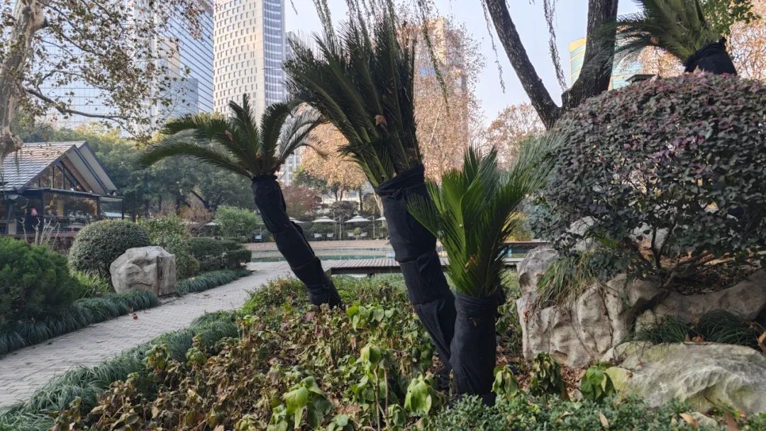 静安公园中还有铁树、红千层等热带树种,这些热带植物均已裹上了厚厚的“外衣”。工作人员也会定期检查植物情况,及时修剪出现冻伤的枝叶。
