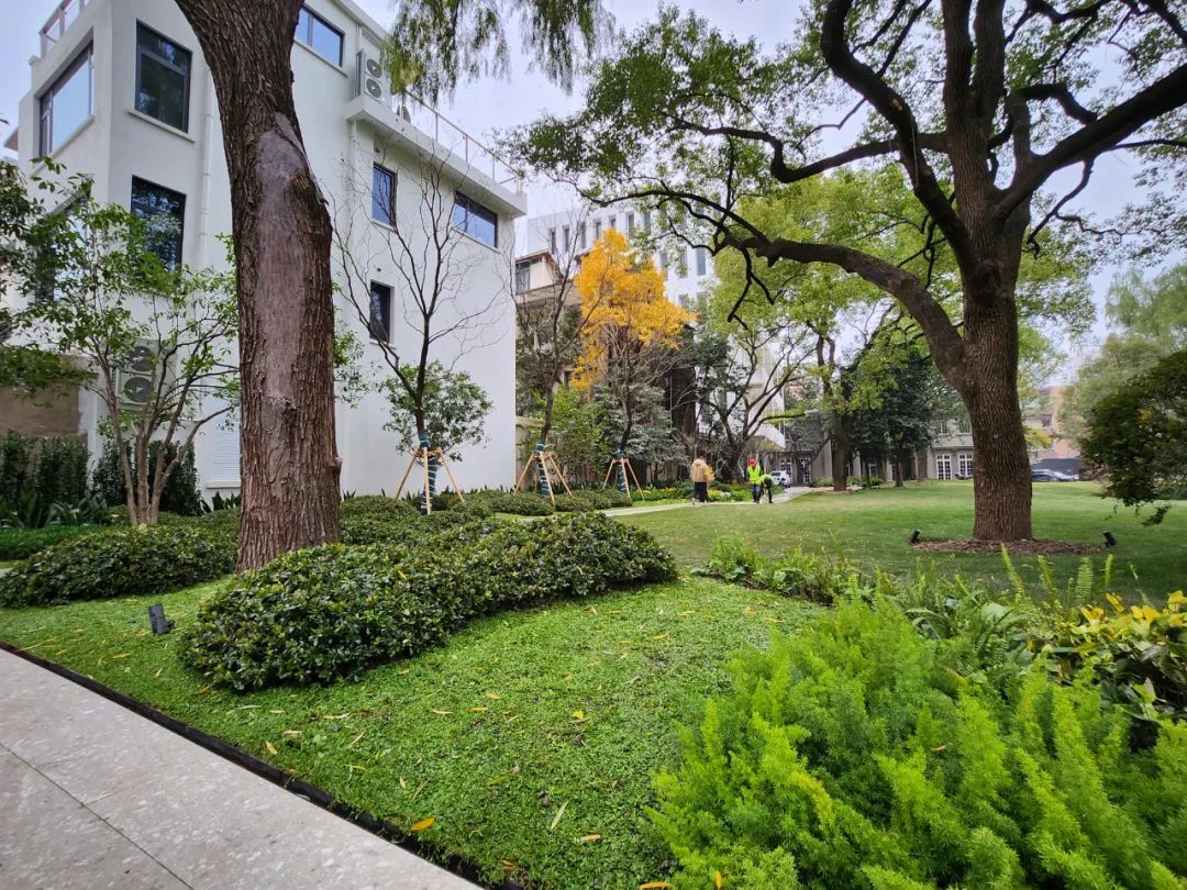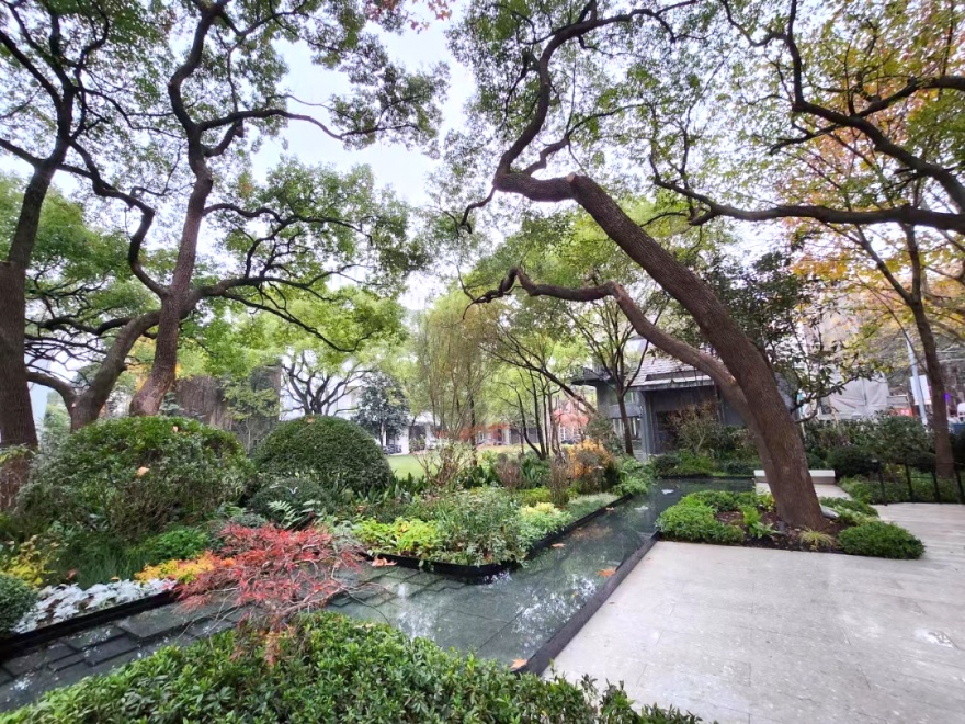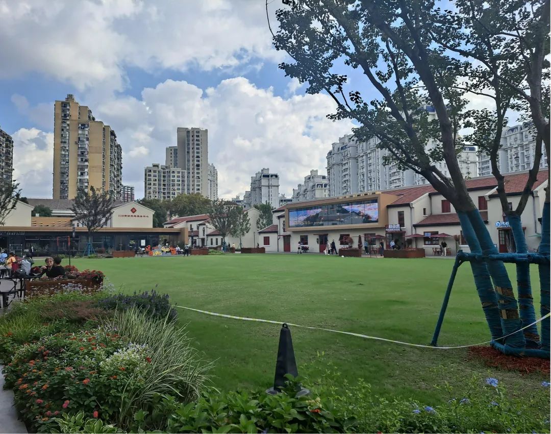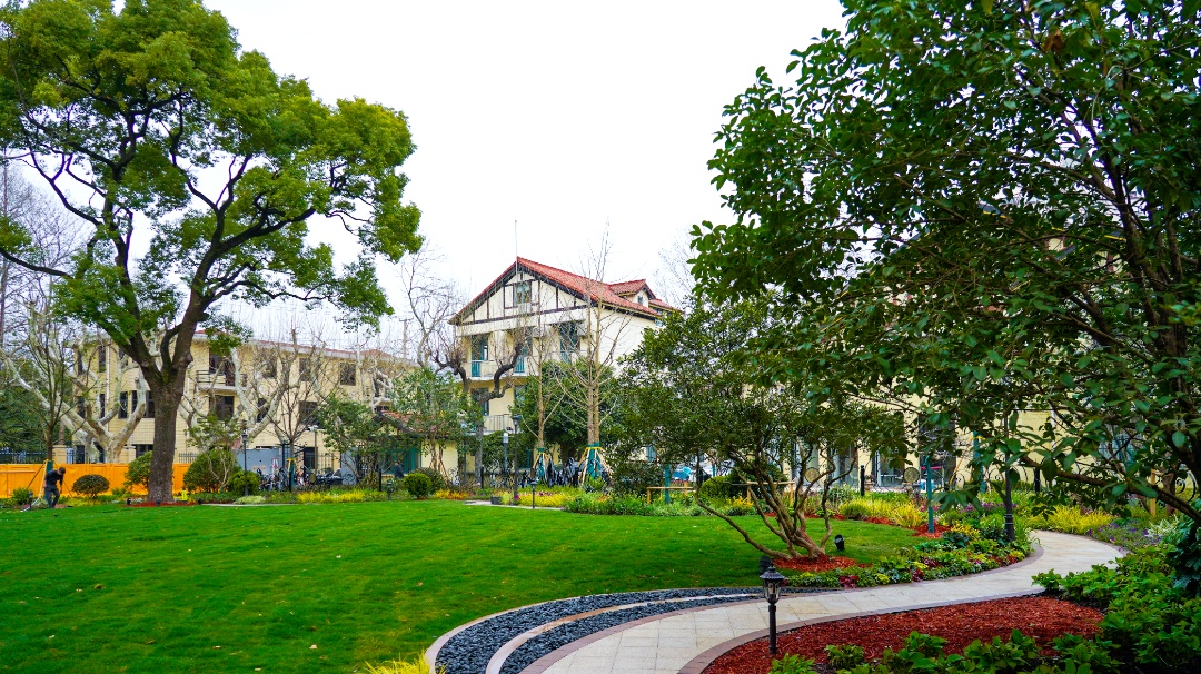 周边环境以社区文化及居住为主,绿化呈规整式乔木和集中式花径布局,保留了中心大草坪等原有风貌,种植樱花、梧桐、香樟,地被搭配金叶石菖蒲、玉簪、大麻叶泽兰等植物,最终形成上木有序、下木繁盛、疏密有致的绿化景观面貌。