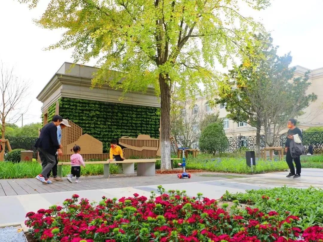 绿地内保留了长势较好的银杏、广玉兰,新栽蓝雪花、五色梅、欧石竹等色彩鲜亮的地被,结合特色道路铺装,构成一幅名为“琴键上的乐章”的生动画面,步道旁还设置了休憩坐凳,方便市民驻足观赏。