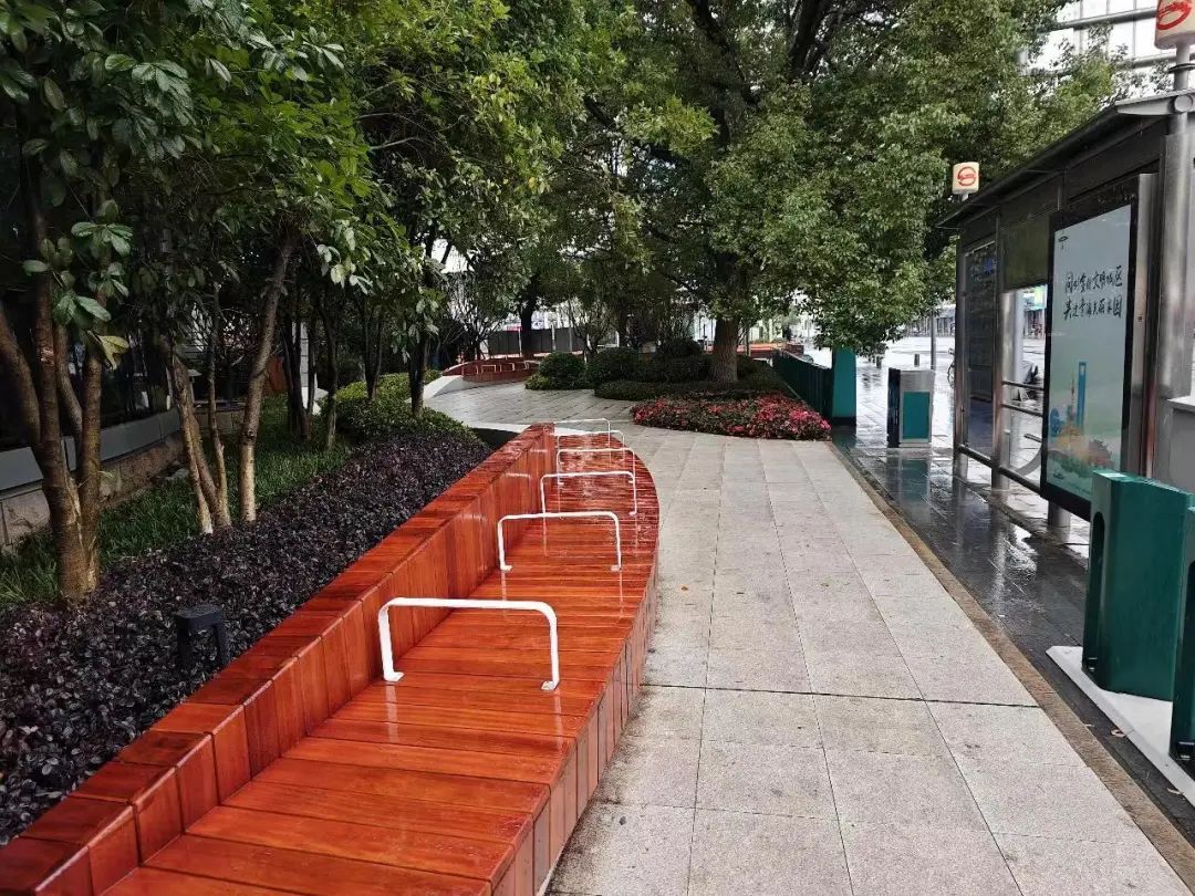 此次改造将站台和非机动车位等服务设施融合,增加了步行小道、休闲座椅、趣味小品,以及儿童活动场地,给周边市民提供了一处游憩场所。景观上配植日本晚樱、垂丝海棠、红枫、桂花等开花或色叶植物,搭配特色地被植物,丰富了整体绿化面貌。
