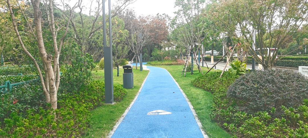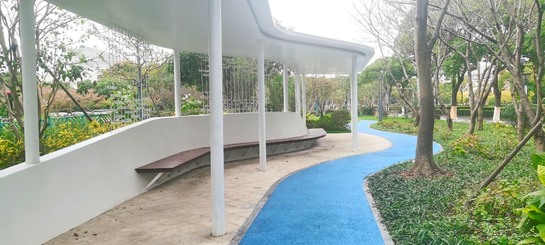 增设了廊架、座椅、小品、照明等设施,铺设蓝色透水步道,连通周边道路,增植了玉兰、早樱、无患子、娜塔栎、鸡爪槭等植物,整体景观面貌得到极大提升,既美化了道路街景,又满足周边市民休闲游览需求。