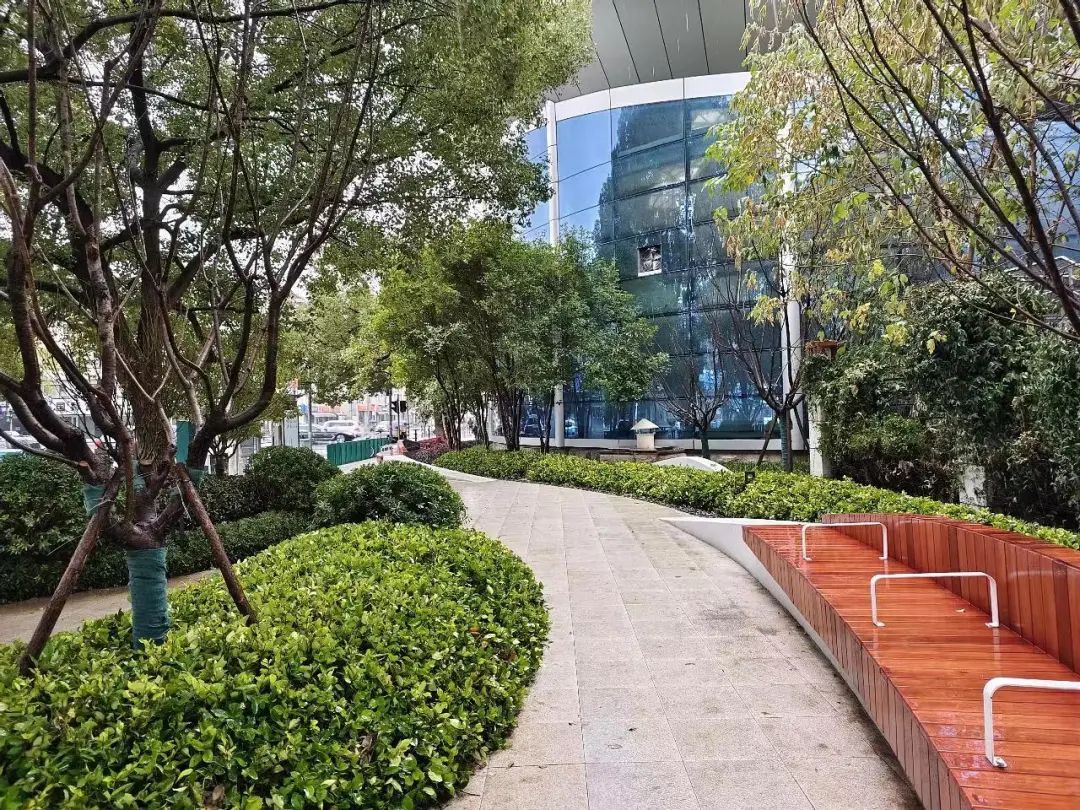 国网上海市电力公司金山供电公司单位附属绿地与周边公共绿地原本是封闭性绿地,本次改造将部分附属绿地与公共绿地融合设计并打开。