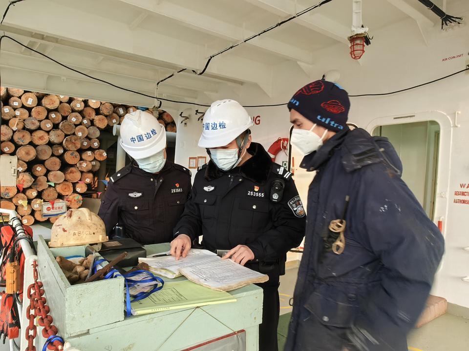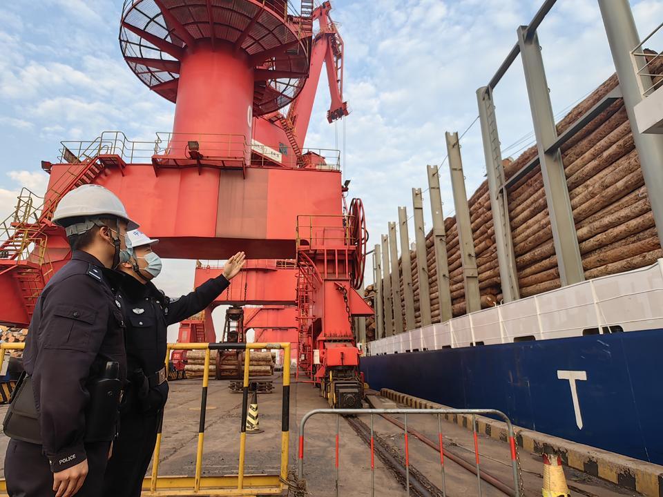 12月26日,山东港口日照港岚山港区2号泊位,山东边检总站岚山出入境边防检查站民警正在对从新西兰入境的载有29800余吨木材的巴拿马籍“新罗”轮开展巡逻检查,一辆辆过驳车辆有序排队等待着吊装木材,港区呈现一派繁忙的作业景象。