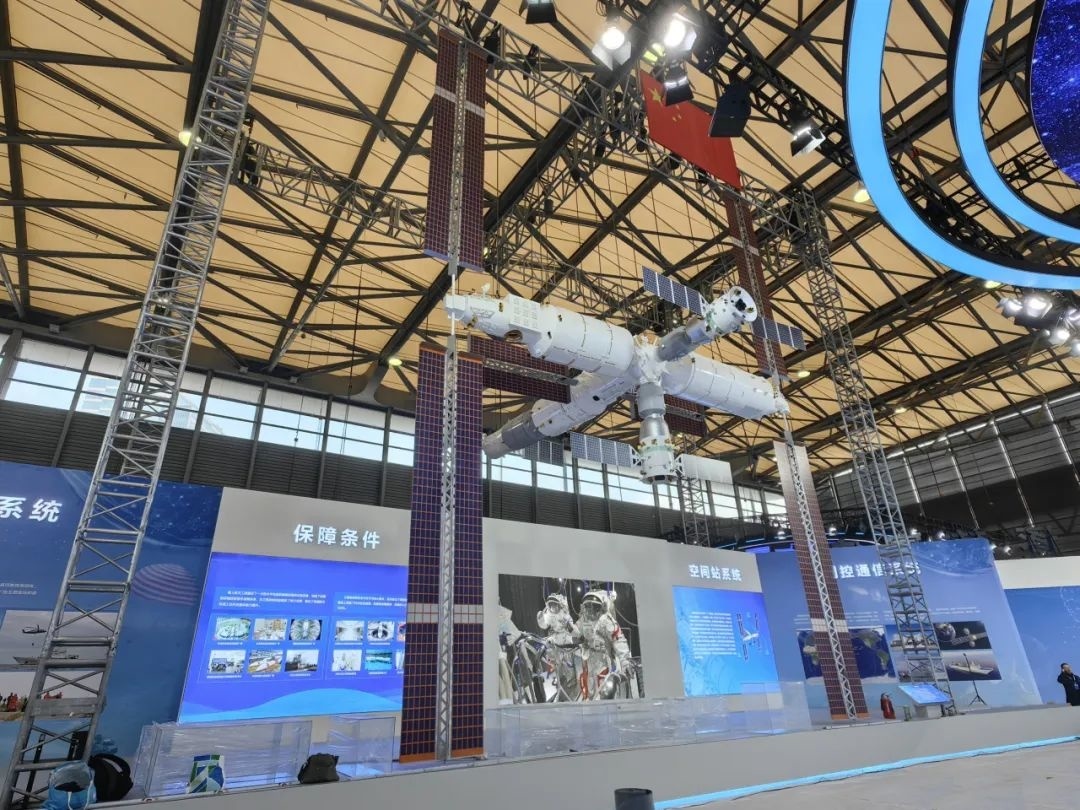 哪些大国重器将重磅亮相? 且看小布在展厅搭建现场为您带来的 独家实景“剧透” ↓↓↓↓↓↓ “天宫”空间站组合体1:4模型 抬头向上看,只见“天宫”正翱翔 “天宫”空间站组合体1:4模型将亮相展会 在空间站组合体模型下仰望 观众们可以体会 从地球望向空间站的浩瀚感受