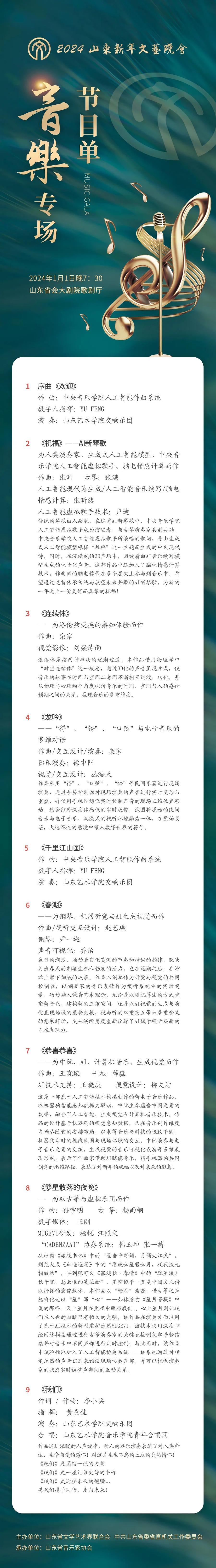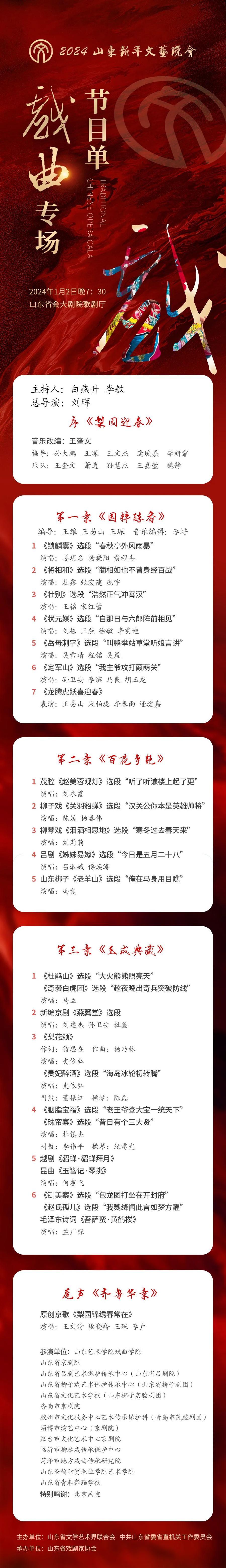 由山东省文学艺术界联合会、中共山东省委省直机关工作委员会主办,山东省舞蹈家协会、山东省音乐家协会、山东省戏剧家协会承办的“2024山东新年文艺晚会”舞蹈、音乐、戏曲专场将于2023年12月31日—2024年1月2日在山东省会大剧院精彩呈现。晚会以“精品文艺献人民、艺彩纷呈庆新年”为宗旨,精选舞蹈、音乐、戏剧等艺术门类的优质文艺资源,邀请省内及全国知名艺术家,以公益、开放的形式,与广大人民群众共享文艺成果,迎接新年的到来。