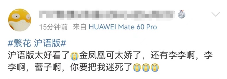 这部由上海原创、上海出品,王家卫执导,秦雯编剧,胡歌、马伊琍、唐嫣、辛芷蕾主演的电视剧,从筹备到开机、从杀青到开播,一直备受关注。27日晚在央视八套开播仅10分钟,收视率就破了2。作为全网独播的视频平台,腾讯直接给了一个大专题,分普通话版和上海话版两个版本播出,全部首页置顶推荐,给足了排面。电视剧《繁花》推出普通话版和沪语版两个版本。12月27日,央视八套电视剧频道播出普通话版,腾讯视频上线两个版本。在原著小说中,金宇澄运用了大量的上海方言内容。而王家卫选用的主要演员几乎都来自上海。此前电视剧《繁花》上海路演播放了沪语版,演员们透露,绝大部分演员、工作人员都会上海话,导演王家卫的上海话也说得很好,剧组就像一个沪语大课堂。“方言和一个地方的历史、文化、性格都有关系的。”胡歌说。唐嫣饰演就职于外贸公司的汪小姐,这是她第一次用上海话演完整部电视剧,“一开始还担心会不会不像在演戏,因为没演过,一进片场,大家都在说上海话,马上就进入状态了。”陈龙饰演阿宝的兄弟陶陶,在他看来,电视剧《繁花》的意义是带着大家一起寻找过去的回忆,坚持用沪语来演,因为这是发生在这里(上海)的故事。上海滑稽戏名家陈国庆在《繁花》中饰演房东葛老师,他表示,“我年龄比较大,剧组遇到不确定的上海话说法,我知道的就跟他们说,不知道的就打电话给‘老法师’请教。”CCTV-8:2023年12月27日19:30普通话版播出、每日2集,12月28日14:30沪语版播出腾讯视频:2023年12月27日19:30普通话版、沪语版同步上线,首更4集,会员每日更新2集CCTV-1:2023年12月29日11:03普通话版、每日1集在开播前,主创们齐聚剧中宝总的阵地和平饭店举办了首映礼,黄河路和进贤路上的主要角色们悉数出席,一起聊《繁花》故事中的那些人,那些事。胡歌在剧中饰演主角阿宝,阿宝赶上时代的浪潮,左手外贸右手股票,不久便成为了宝总。胡歌解释,在他心中,阿宝很难用一两句话概括,“他是雄心万丈的人,在奔腾时代里是个上进的人,但不管起伏,他心中最重要的是情谊。”他透露,宝总的重感情也将会是观众在剧集结尾会感动的地方。太突然,一个月内搬离!上海爷叔阿姨的“最爱”真要关了,全来扎堆补货疯狂动物城半途下车儿童系被游览车撞倒?现场视频流出!上海迪士尼最新通告