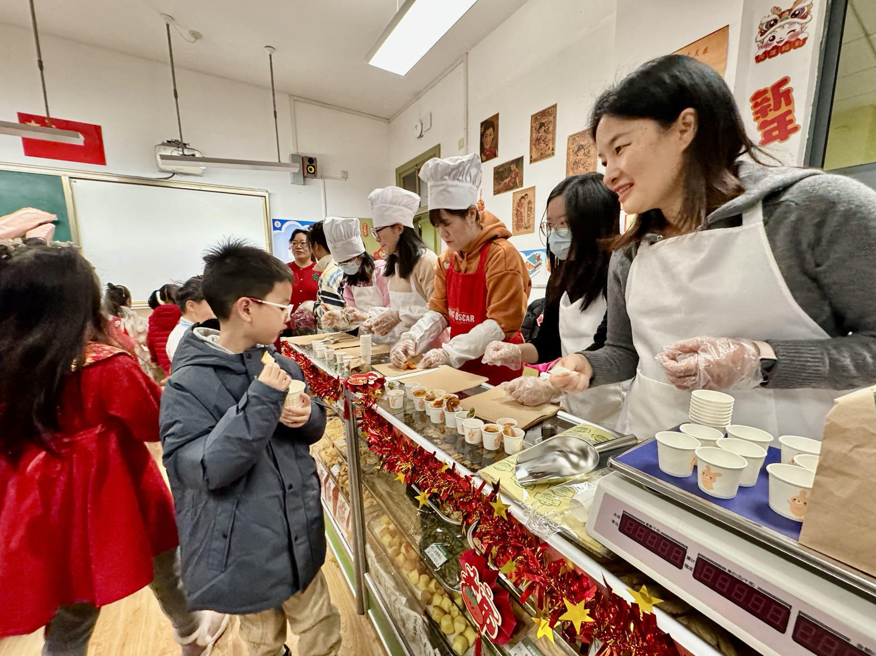 经过一番精心打扮,四年级男孩谢佳宸和伙伴们像过年赶集一样,兴奋不已。他说,自己很好奇什么是妈妈口中的“烟纸店”:“妈妈提前告诉我,要去‘烟纸店’看看,这是他们小时候的回忆。”二年级女孩康瑜果在教室里看老师炒爆米花,小眼睛里充满了期待:“这里好多小吃都是我没有见过的,而且我只在电影院里吃过爆米花,能在学校里吃到这么多上海小吃,真的好有趣呀。”