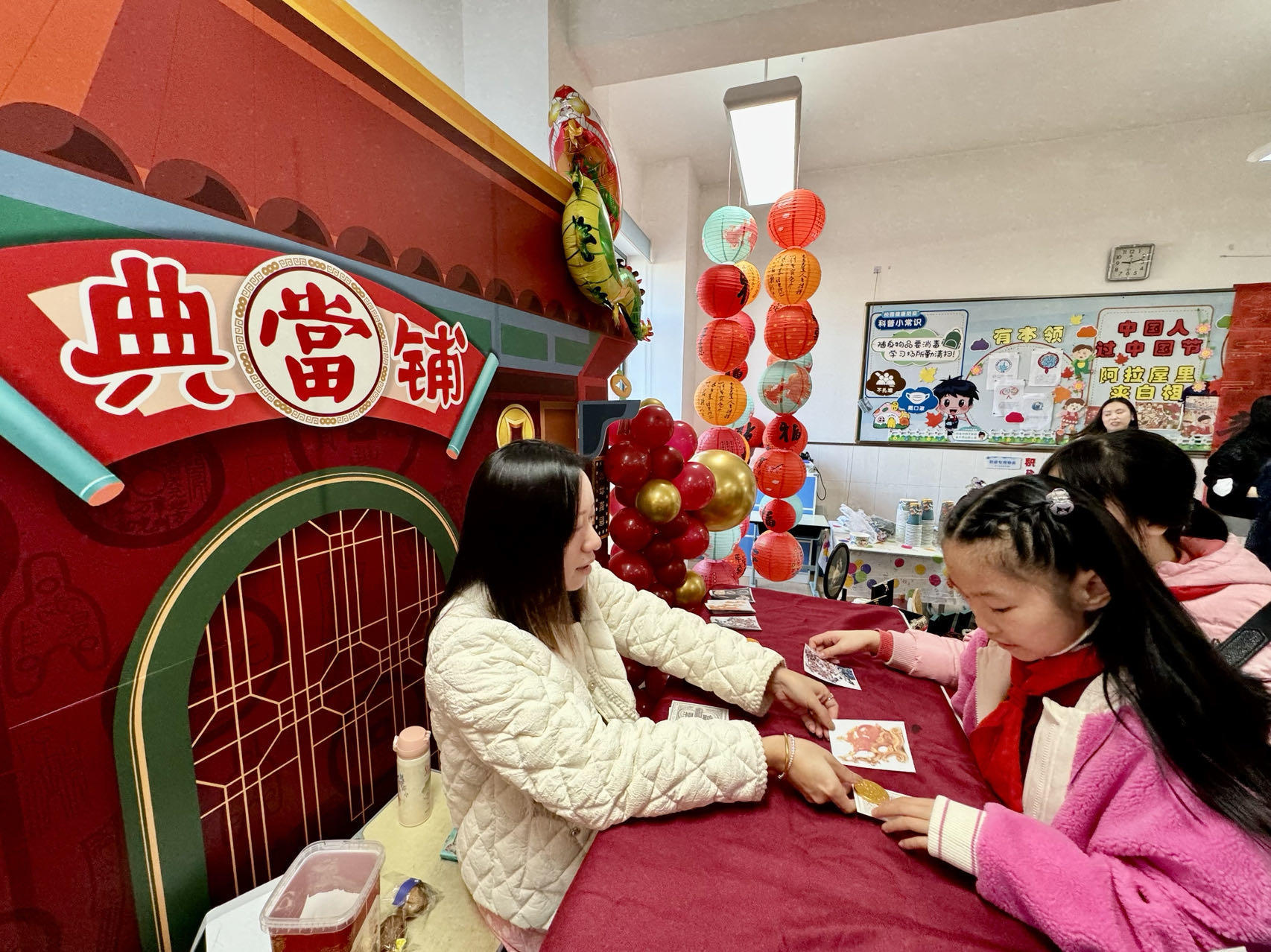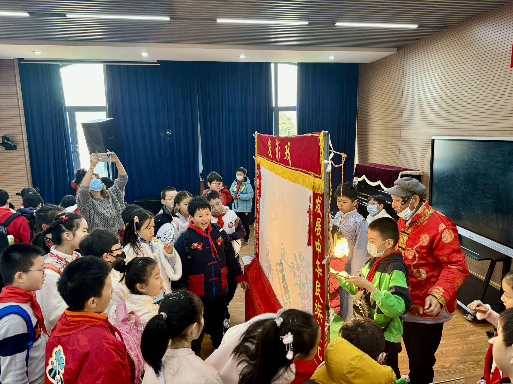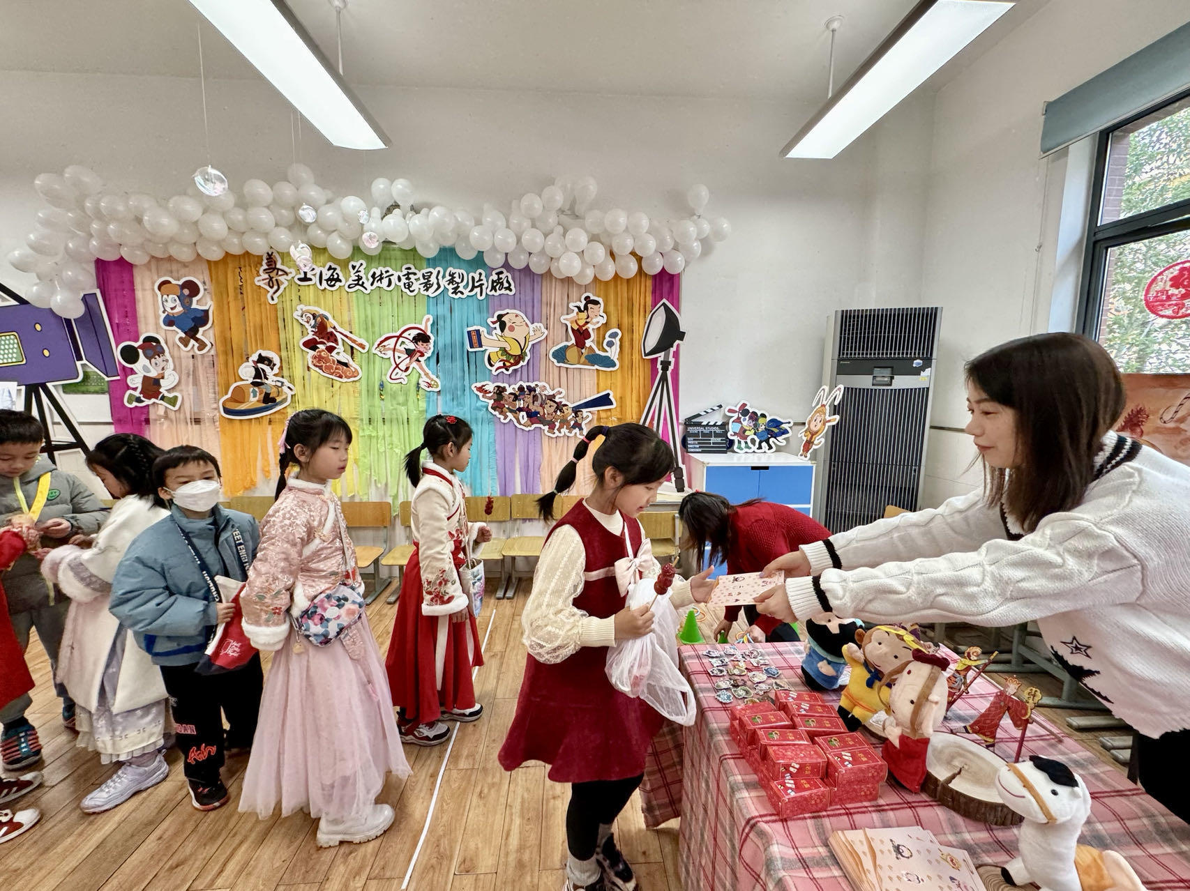 老虎灶、小人书摊、典当铺……这些蕴含老上海特色的项目也被一股脑儿地“搬”进四楼教室。六楼大礼堂成了“白相大世界”,皮影戏、捏泥人、服装设计,让孩子们身临其境、乐在其中。