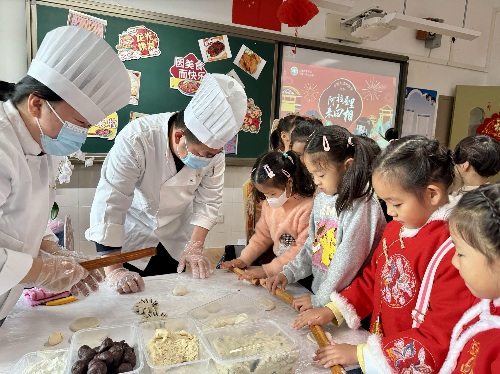 教学楼二楼,飘出各种地道上海美食的香气。杏花楼、大富贵、光明邨……富有上海本帮特色的美食被“复刻”进了一个个教室里,令孩子们目不暇接。一4班教室摆出了一个“早饭摊”:“四大金刚”、小馄饨、豆腐花,充满浓浓的市井烟火气;一8班教室里,光明邨的点心师傅正在教孩子们尝试制作豆沙饼;二5班教室以老上海饮料为主题,展示了颇具“年代感”的乐口福、麦乳精、盐汽水等传统饮料。