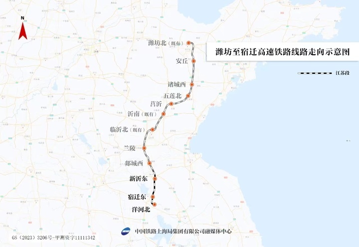 项目正线全长约399公里,设计时速350公里,建设工期4年半,其中江苏段正线长约74公里,在徐州市设新沂东站,在宿迁市设宿迁东站和洋河北站。