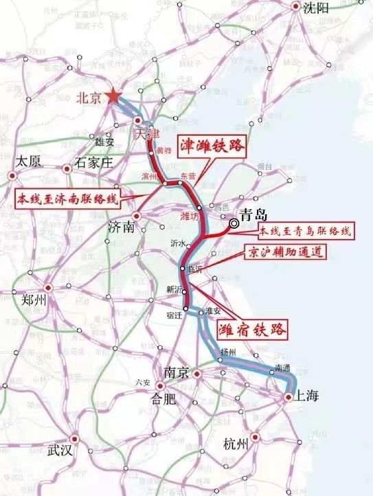 从全国铁路干线网看,京沪辅助通道贯通京津冀、山东半岛、淮海经济区、长三角等城市群,将整个沿海地区,也是我国经济相对发达的东部地区串联成一个有机整体。此外,潍宿高铁还与青岛连接线、合宿高铁共同构成合肥至青岛快速通道,对完善国家高速铁路网布局、加强内陆与沿海地区经济融合,有利于支撑“一带一路”倡议、长江经济带和长三角区域一体化发展战略,加快构筑现代综合交通运输体系。