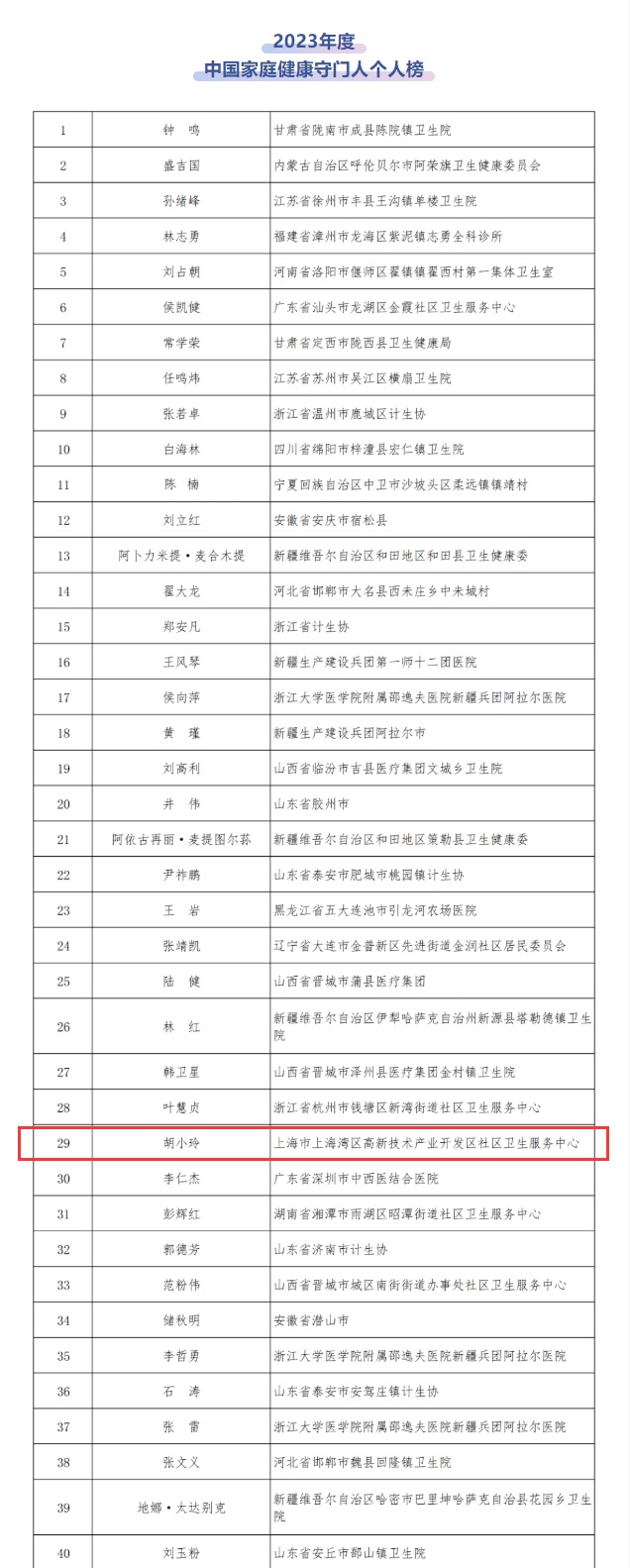 近日,2023中国家庭健康大会在北京召开“中国家庭健康守门人”2023年榜同步揭晓共评选个人案例90个团队案例60个其中,金山区高新区社区卫生服务中心家庭医生胡小玲荣登2023年度“中国家庭健康守门人”榜单个人榜