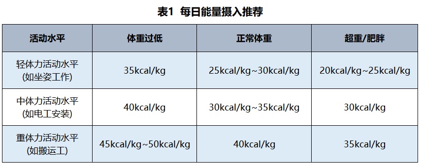 控制每日总热量摄入(具体摄入能量以达到并维持正常体重为标准,并根据患者的身高、体重和体力活动水平等进行调整,详见表1)。