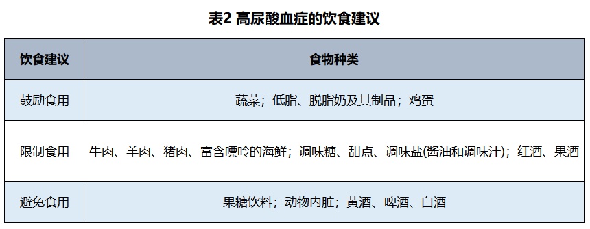 坚持以低嘌呤食物为主(表2),每日食用新鲜蔬菜应达到至少500克、饮用脱脂或低脂乳类及其制品300ml、食用鸡蛋1个,限制动物内脏、海产品和肉类等高嘌呤食物的摄入。