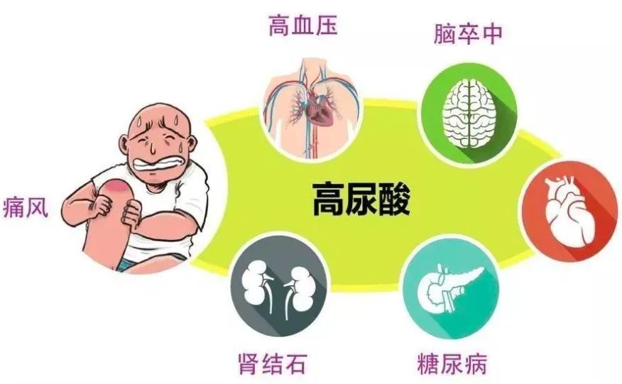 大多数高尿酸血症患者并没有临床症状,但部分病人可以发展为痛风,表现为痛风性关节炎、痛风肾、痛风石等。此外,高尿酸血症还与肾脏、内分泌代谢、心脑血管等系统疾病的发生和发展有关。