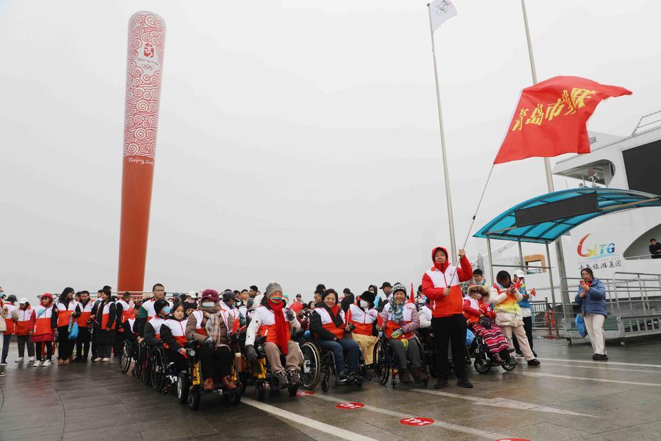 伴随发令枪响,青岛市残联代表队挥舞旗帜,以饱满的精神状态从火炬大道出发,视障人士和志愿者手上拉起陪跑绳,在志愿者的陪伴下迈出矫健的步伐;轮椅跑者滑动轮椅,奋勇向前……别样的身影,一样的精彩。
