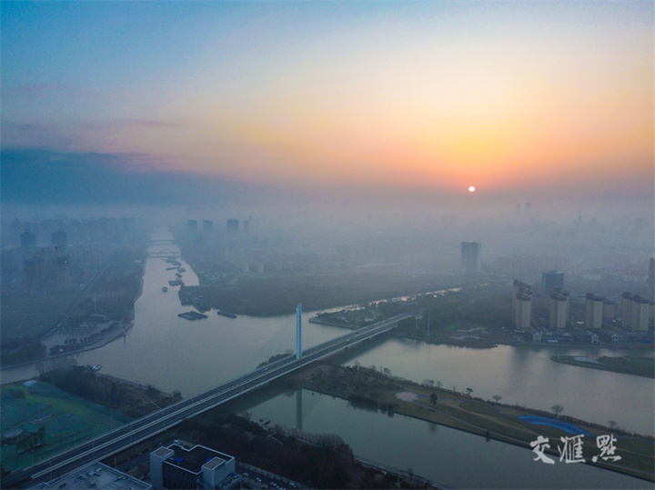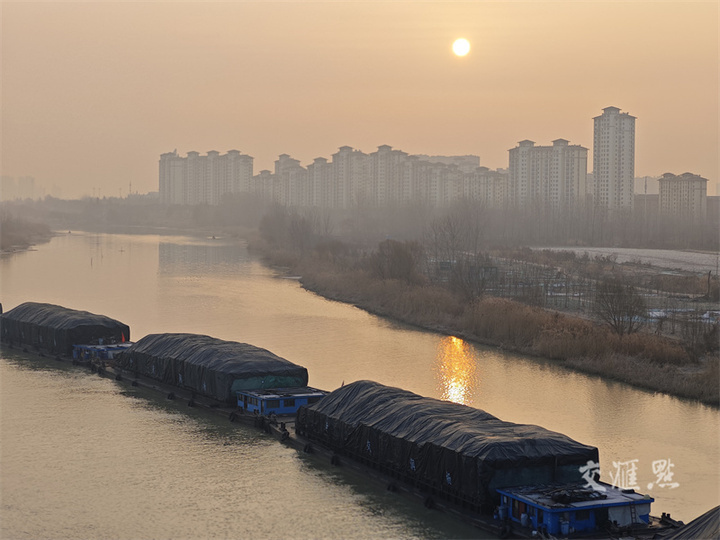 1月1日,新年的第一轮朝阳冉冉升起,黄金水道京杭大运河宿迁市运输船只穿梭往来,开启新一年的繁忙奋进。仲启新 摄 视觉江苏网供图