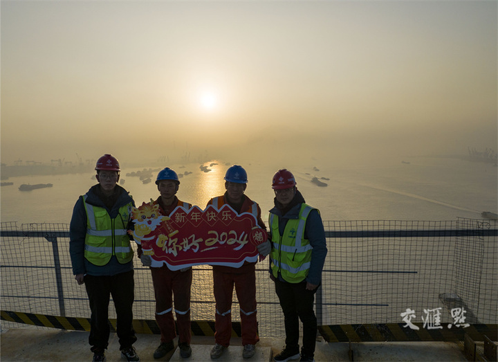 1月1日,中交二航局工人在常泰长江大桥建设现场迎接2024年的第一缕阳光。汤德宏 赵振宇 摄 视觉江苏网供图