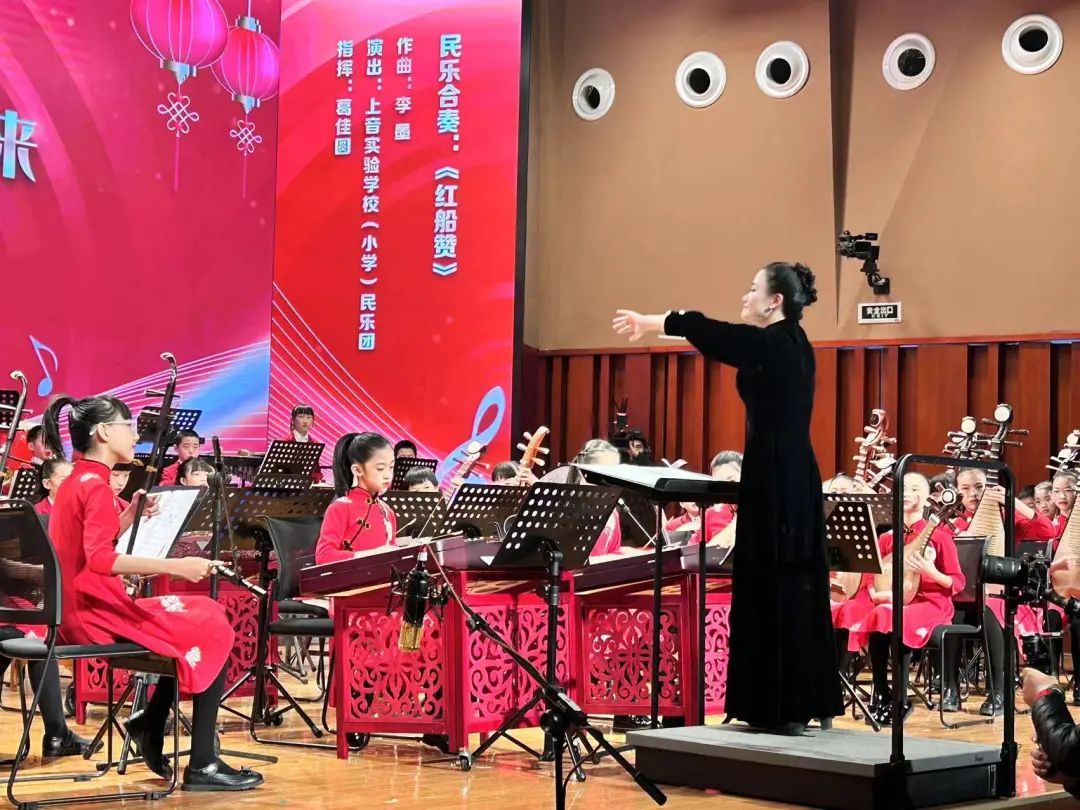 上音实验中学部民乐团带来压轴曲目《春华秋实》与《龙腾虎跃》。回望祖国成长历程,颂扬各行各业人群辛苦付出,展现了中华民族龙腾虎跃、奋勇前进的风貌,将音乐会气氛推至高潮。