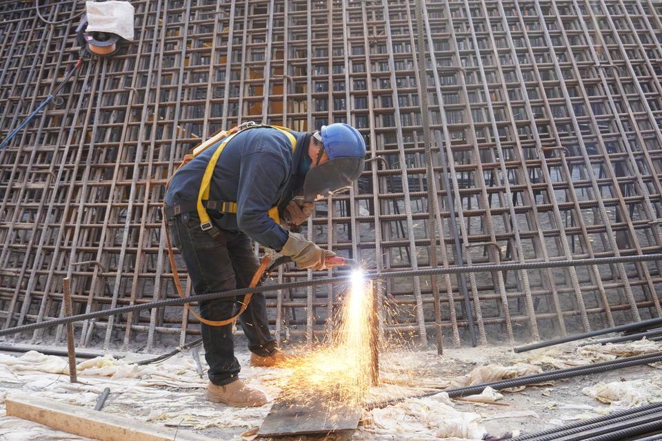 低温雨雪和冰冻恶劣天气是冬季施工的最大挑战。从高空俯瞰大桥主塔569#墩,承台施工盖上了一床绿色棉被。“今年比去年要冷,最冷的几天温度到零下15度以下。我们自己不怕冷就怕混凝土挨冻。”技术负责人陈强说,为防止气温过低造成混凝土受冻,保障冬季施工质量和人员安全,项目部增加了机械设备、材料和人员的投入。大桥主墩承台浇筑区运用了大体积混凝土智能温度控制系统,作业人员每两小时对施工环境进行一次测温,通过搭建保温棚、覆盖棉被、设置大功率暖风机等保温措施,确保混凝土芯部与外表面温差不超过20℃。