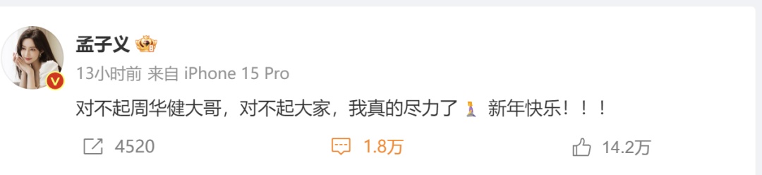 孟子义连夜发微博道歉,称“对不起周华健大哥,对不起大家,我真的尽力了”,并祝大家新年快乐。