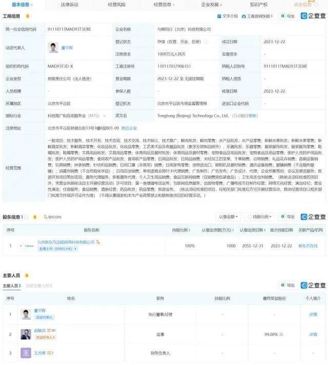 企查查显示,与辉同行(北京)科技有限公司于2023年12月22日成立,注册资本1000万元,董宇辉为法定代表人、执行董事、经理,新东方教育科技集团有限公司主席俞敏洪担任监事,最终受益股份为99%。